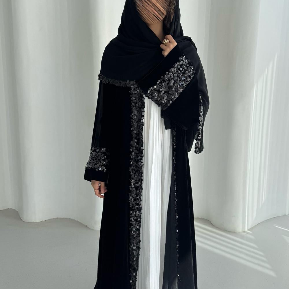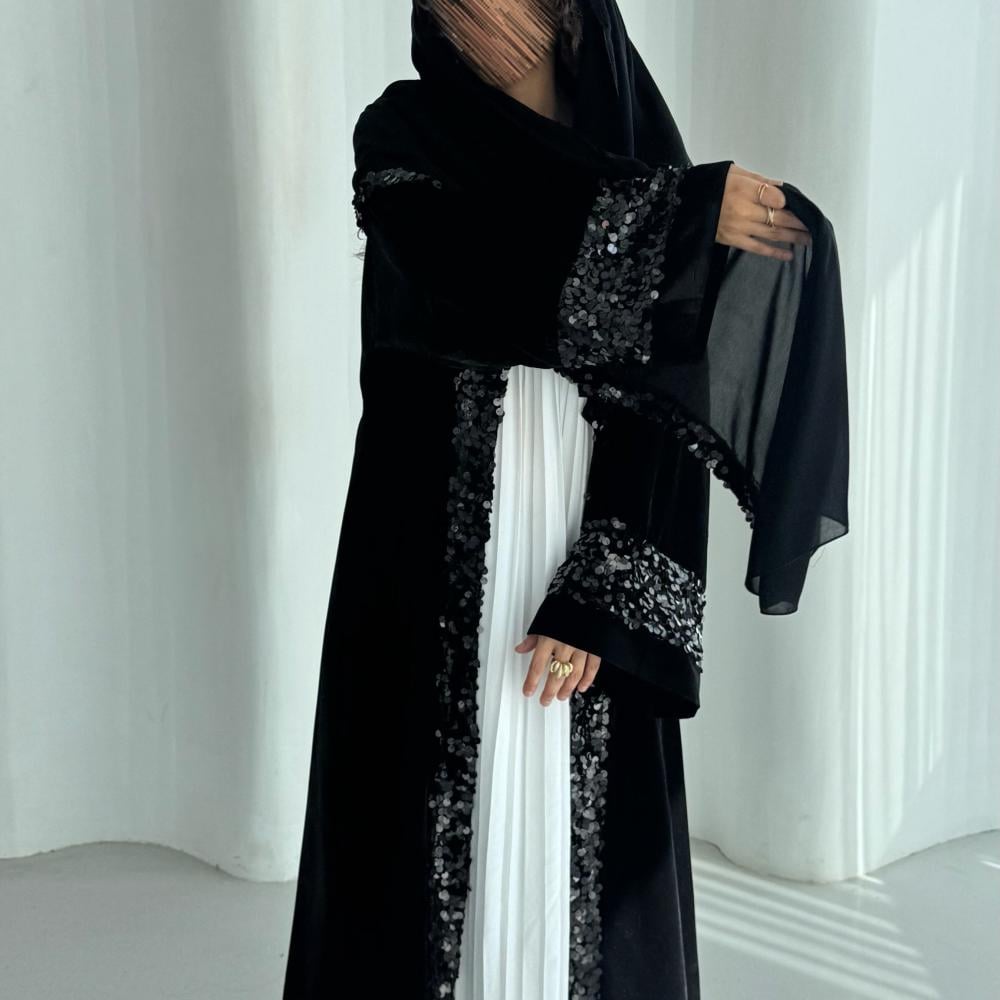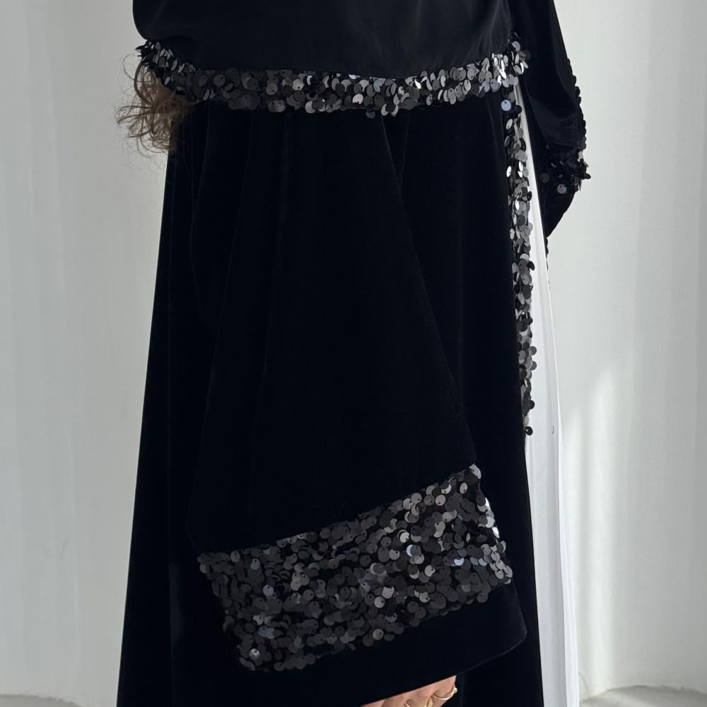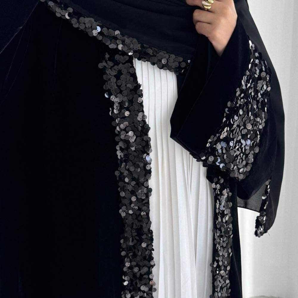 عبايه مخمل اسود بأكمام ترتر لمعه و امام العبايه ، كلوش شامل الطرحه اطراف ترترنأمل مراعاه العبايه بالغسيل