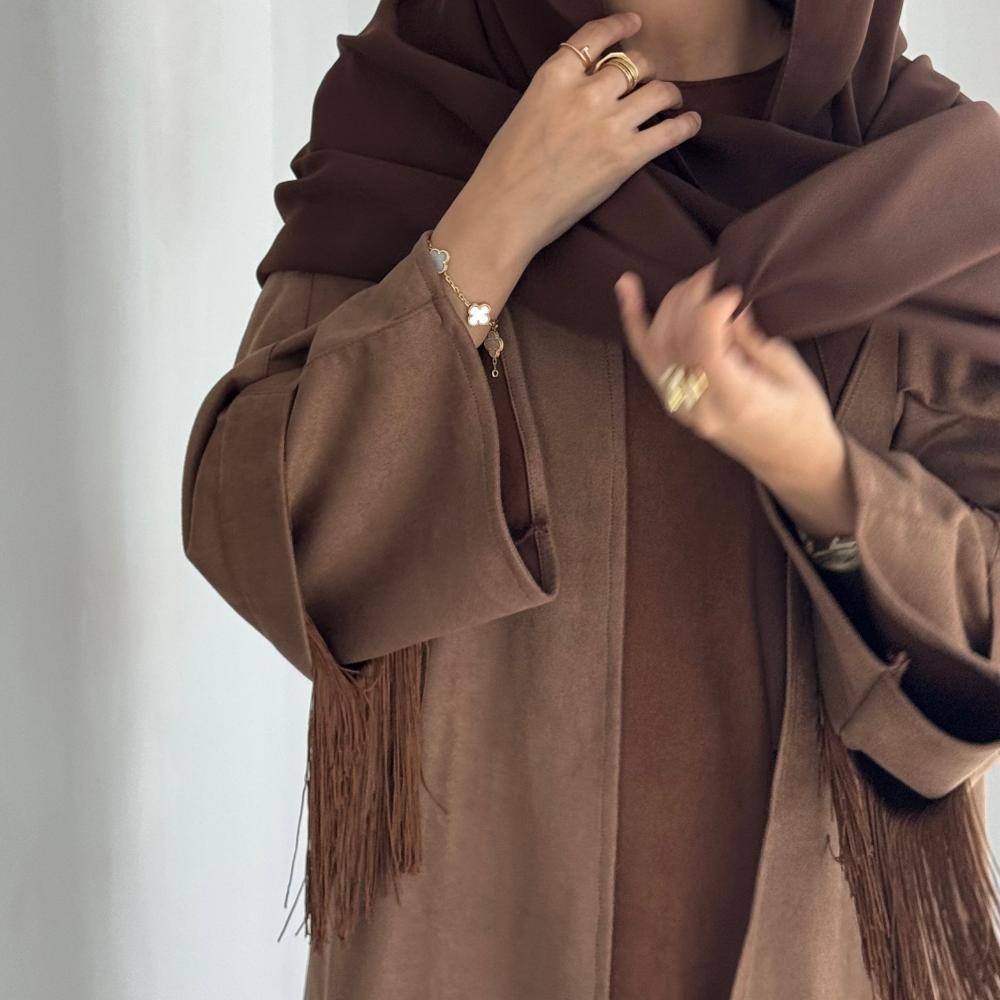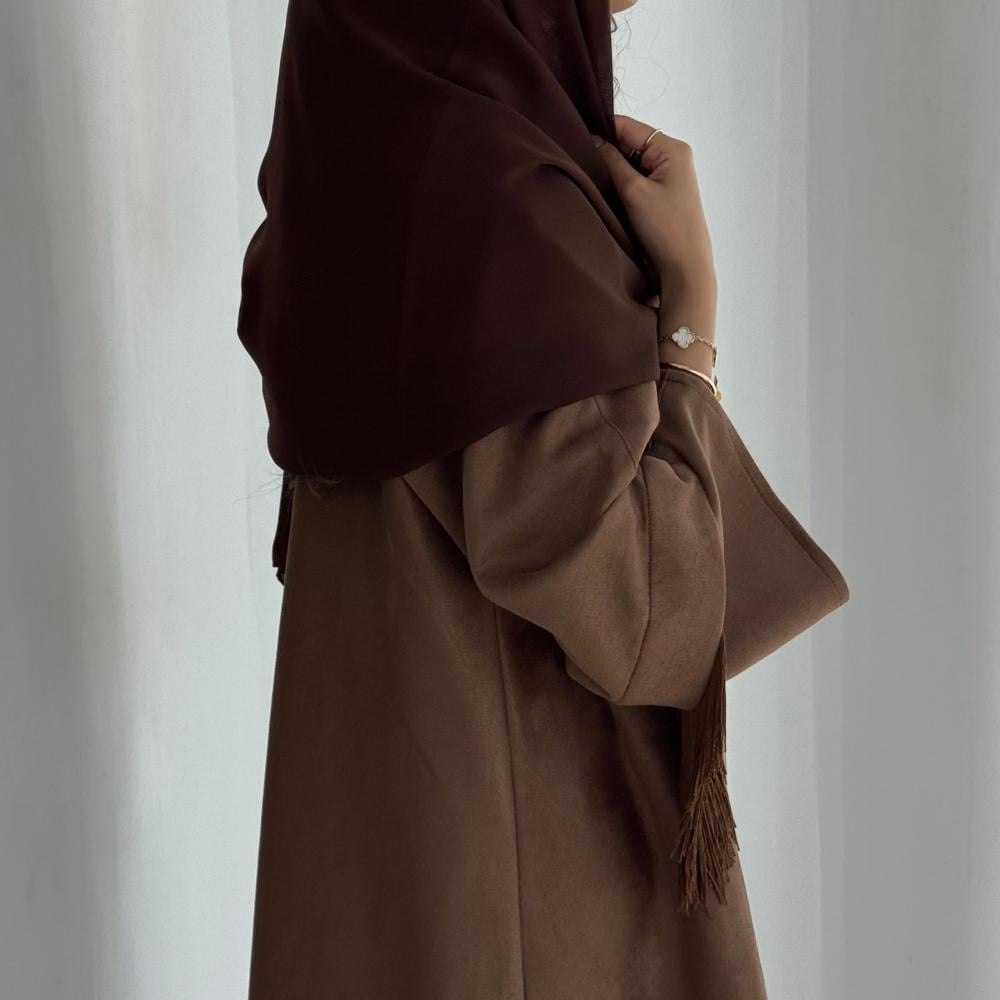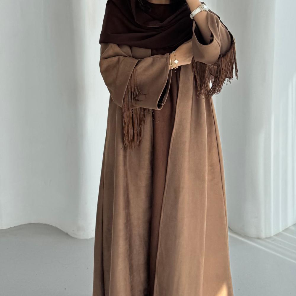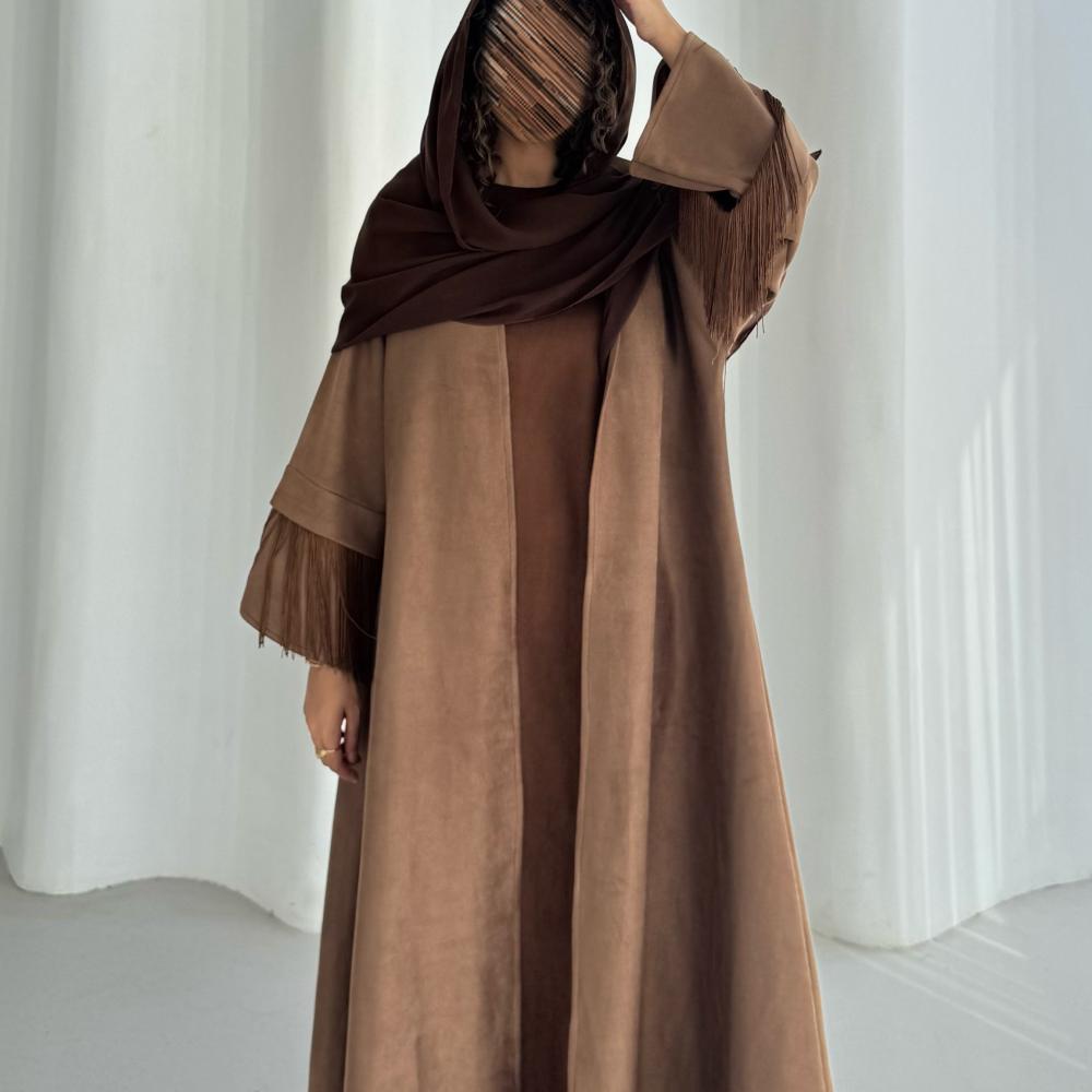 عبايه شامواه بني فاتح مع فستان شامواه بني غامق و هدب بالاكمام بني شامل الطرحهنأمل مراعاه العبايه بالغسيل