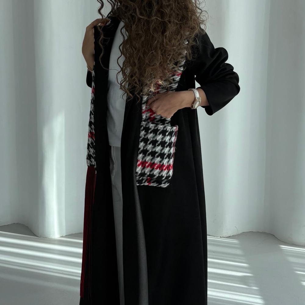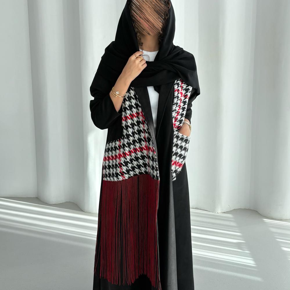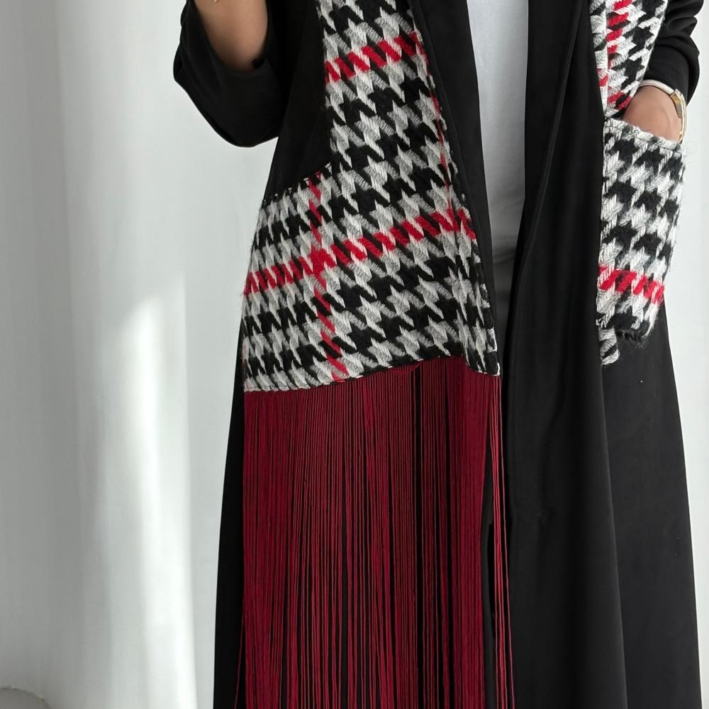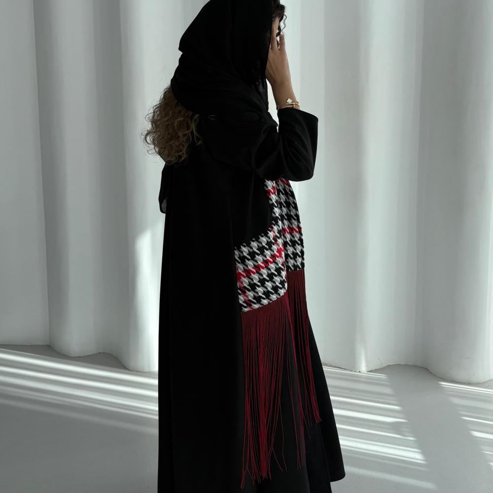 شامواه اسود كلوش ب ياقه و صوف ملون مع هدب احمر ، شامل الطرحه
