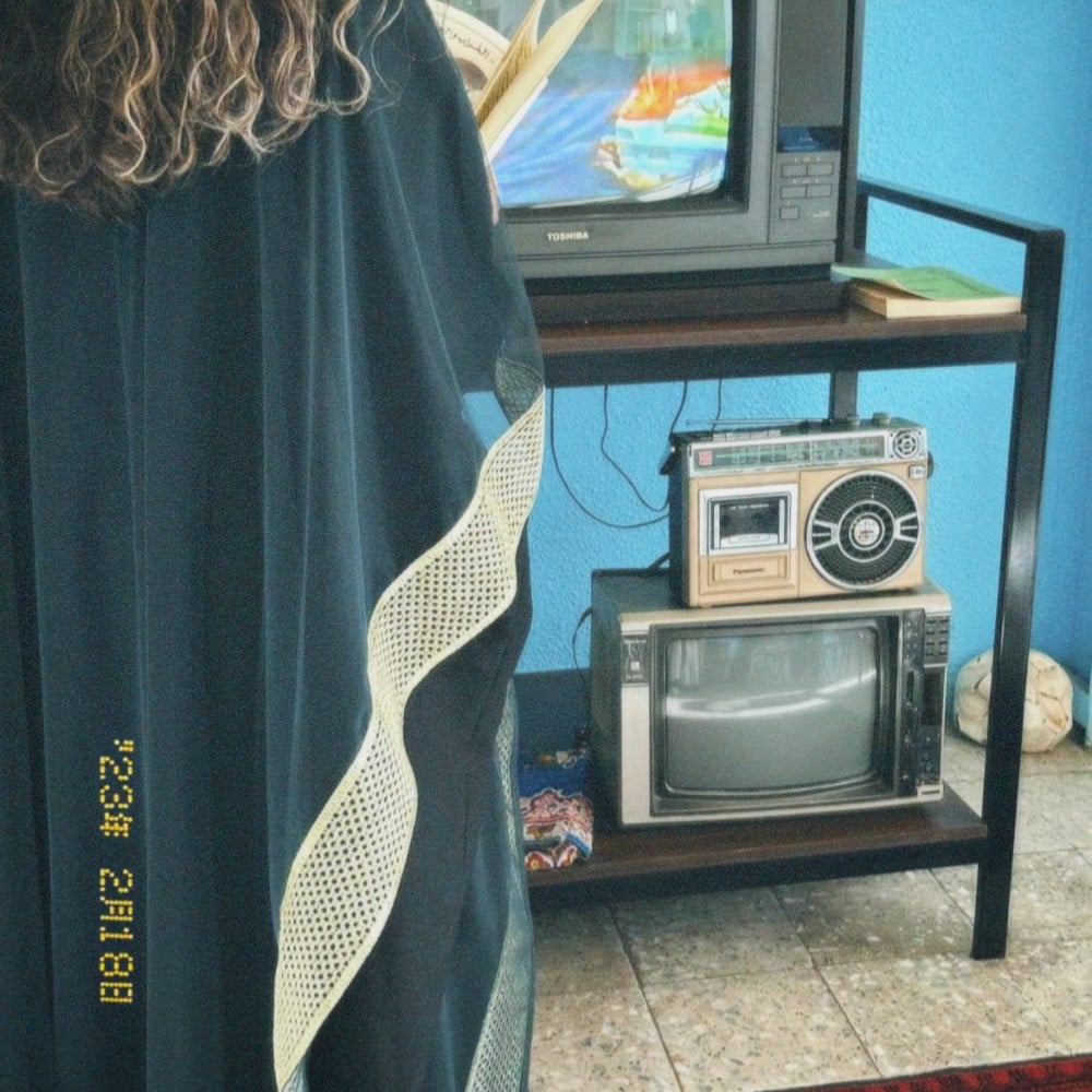 عبايه بشت بقماش كريب تايوان و فوقه تل اخضر غامق ، باطراف كلفه ذهبيه ، شامل الطرحه نفس لون التل اخضر غامق