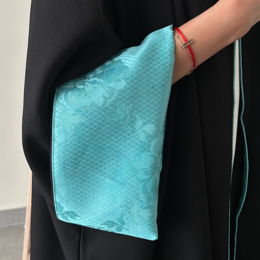 عبايه كتان اسود قصة نص بشت ، و الكم وسيع مبطن ب قماش سماوي منقش بورود ، اطراف العبايه من الامام سماوي و اطراف الطرحه .