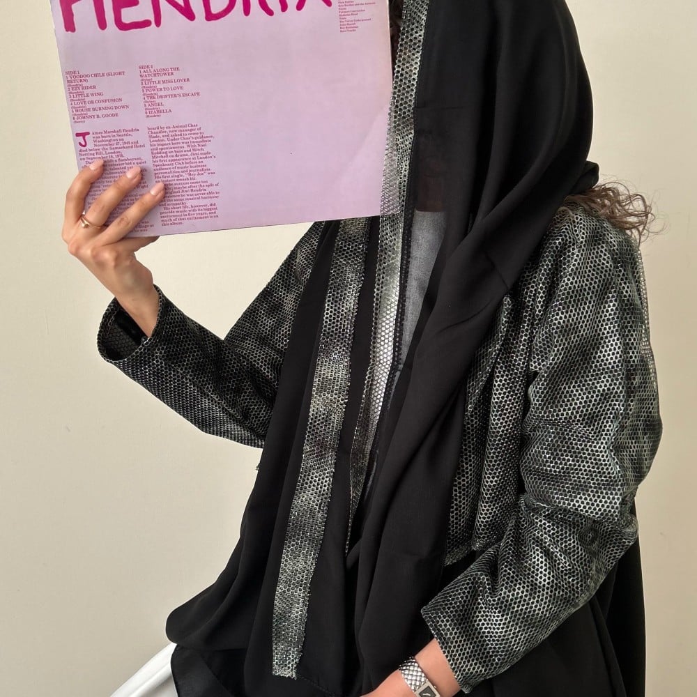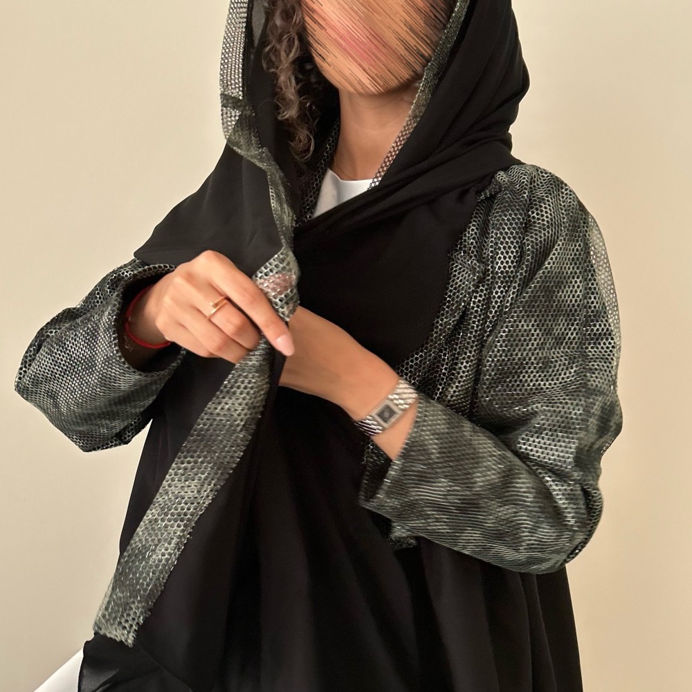عبايه كتان اسود كلوش ، وطبقه جاكيت قماش مخرم ، بعده الوان ، شامل الطرحه
