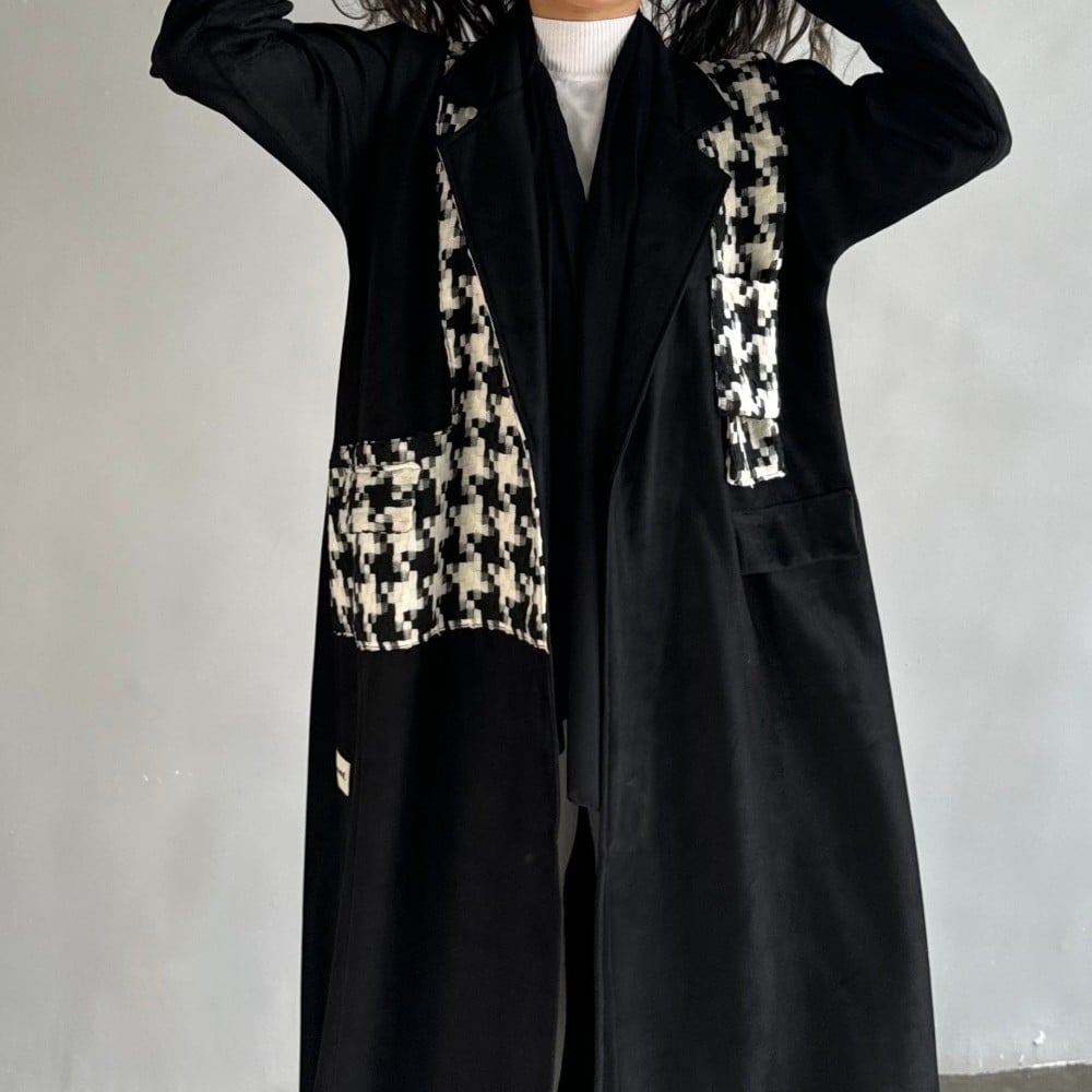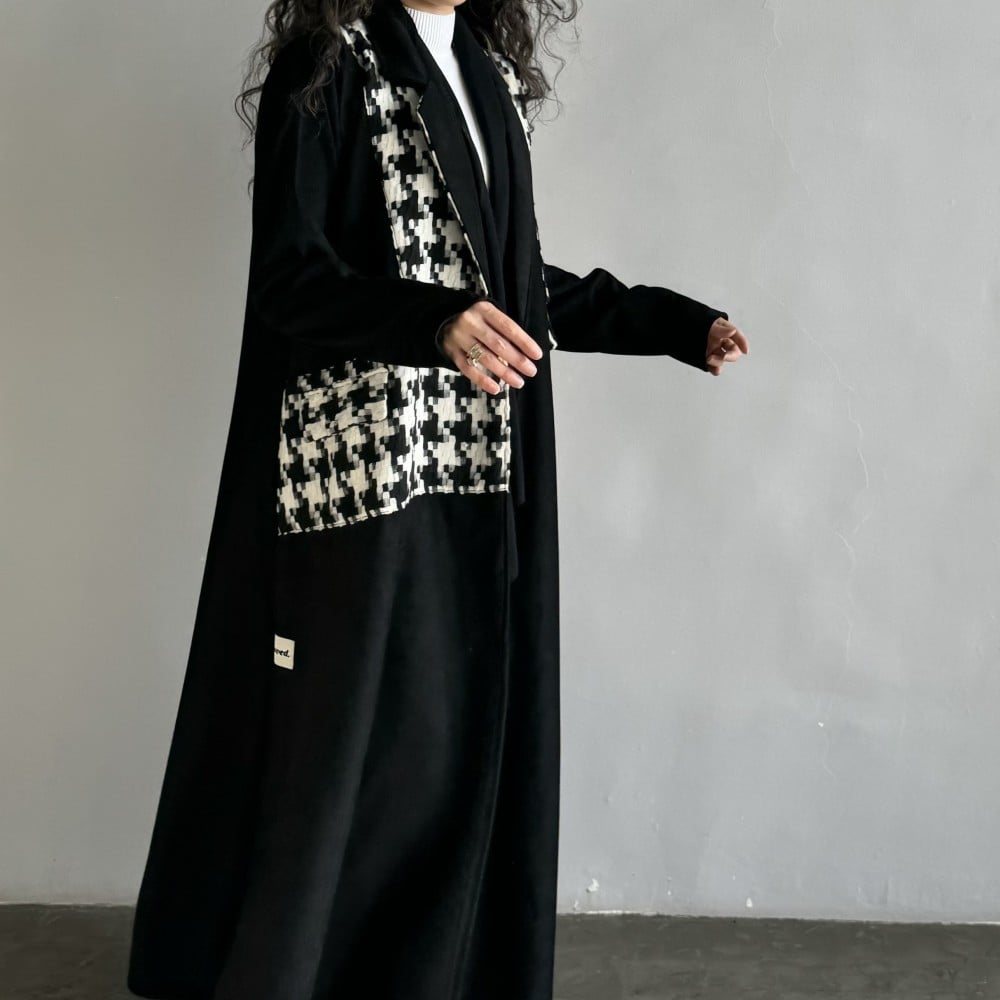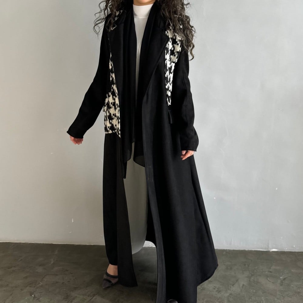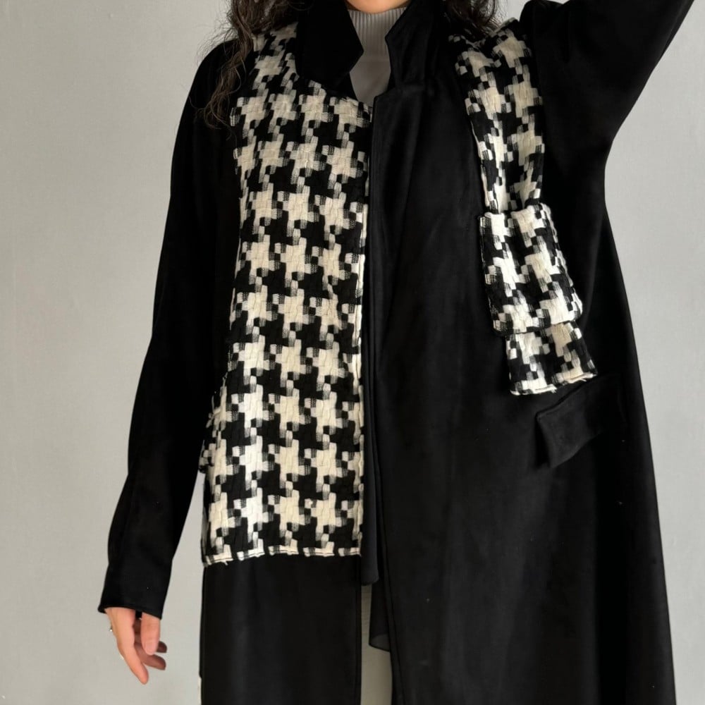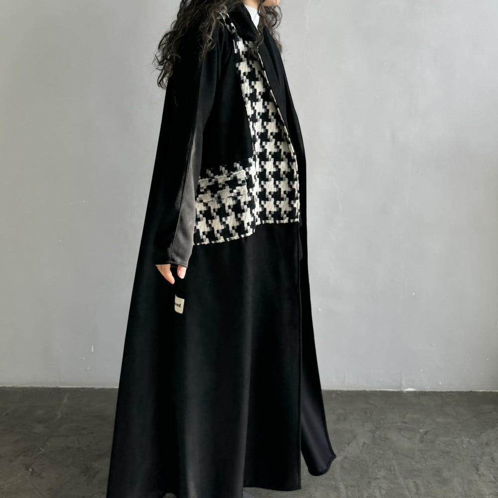 عباية قماش شامواه اسود نص كلوش ، ب ياقه ، وعليها قماش صوف كاروهات