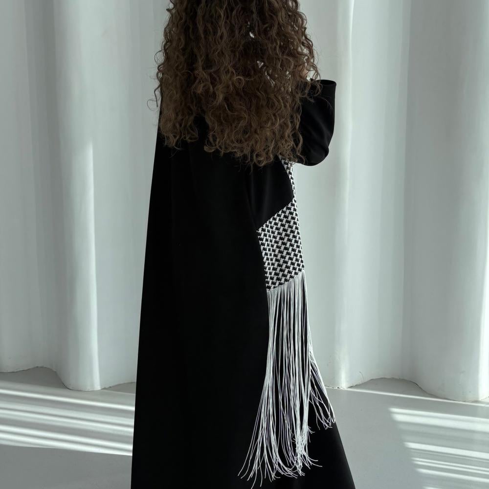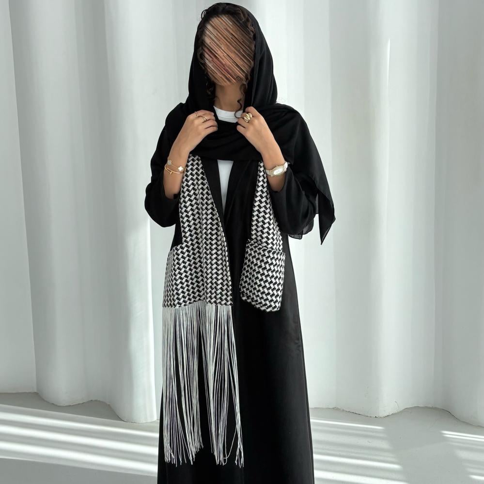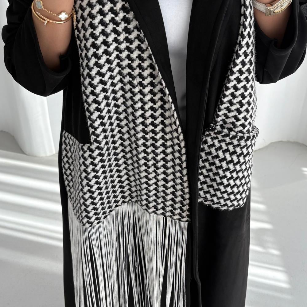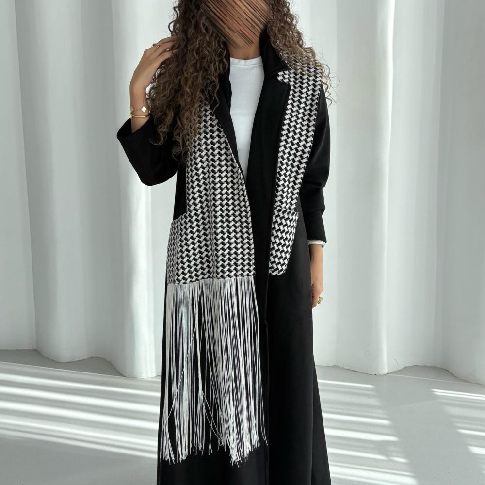 شامواه اسود كلوش ب ياقه و صوف مع هدب ابيض ، شامل الطرحه