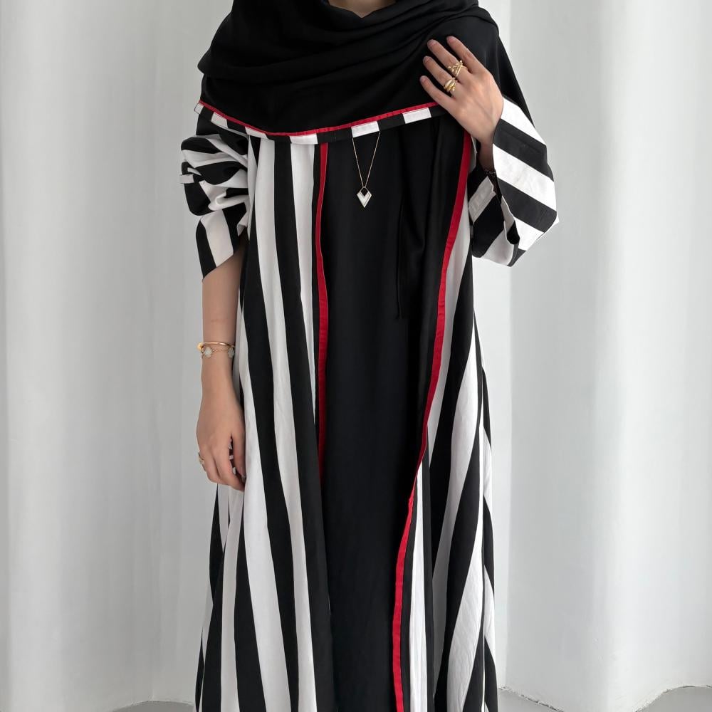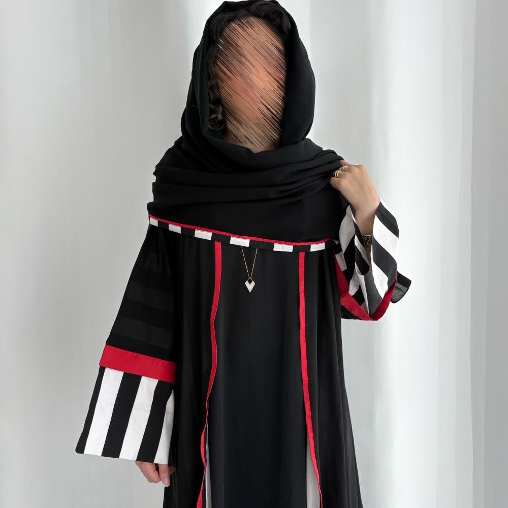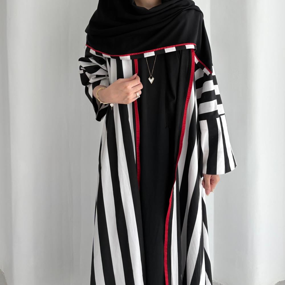 القماش: قطن مخطط مبطن بقماش طرحة باطراف حمرا شامل الطرحه القصه: كلوش ملاحظه: العبايه دبل فيس ، ونأمل مراعاه عند الغسيل
