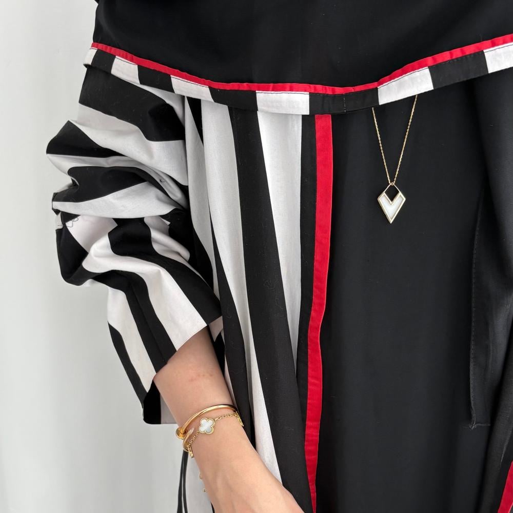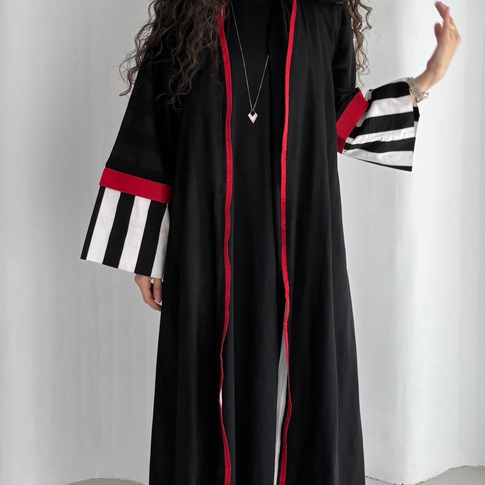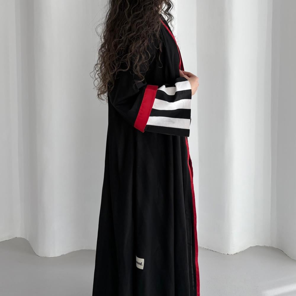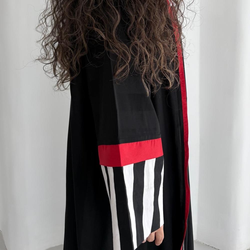 القماش: قطن مخطط مبطن بقماش طرحة باطراف حمرا شامل الطرحه القصه: كلوش ملاحظه: العبايه دبل فيس ، ونأمل مراعاه عند الغسيل