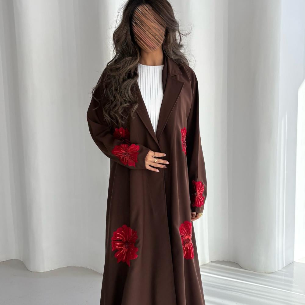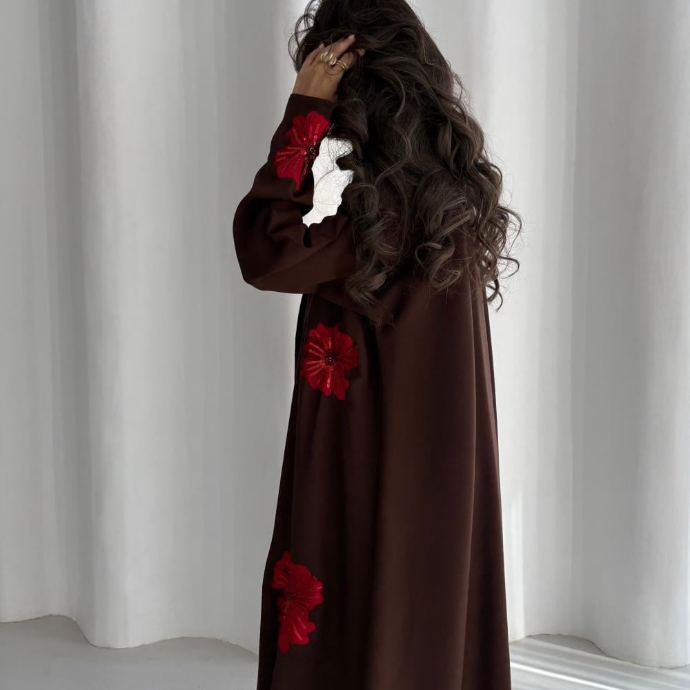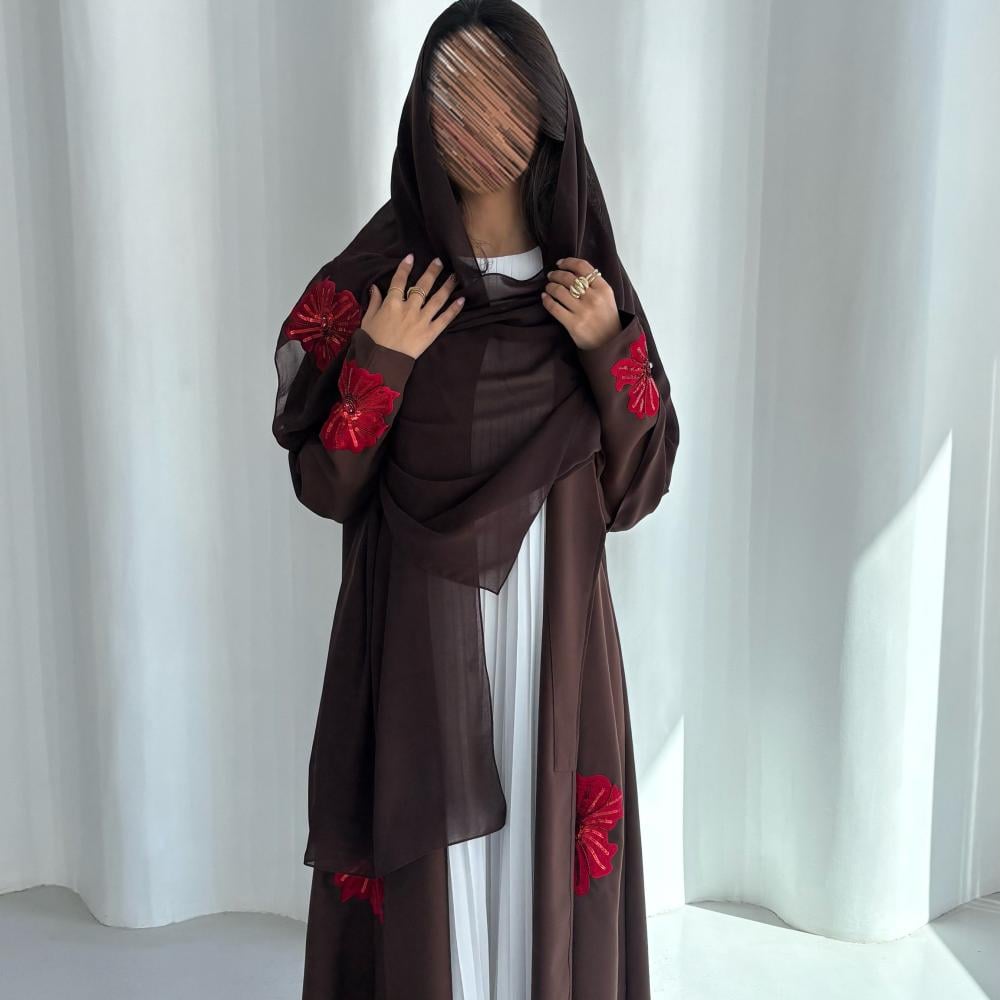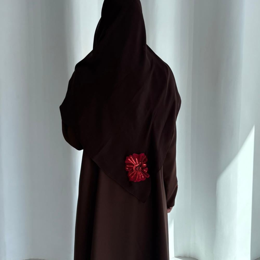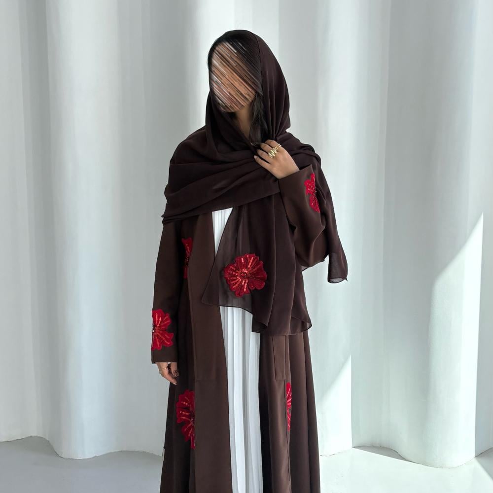 عبايه صيفي بني غامق ،شك ورد احمر ( فيه لمعه) بالامام اربع وردات وشامل شك الطرحهنأمل مراعاه العبايه بالغسيل
