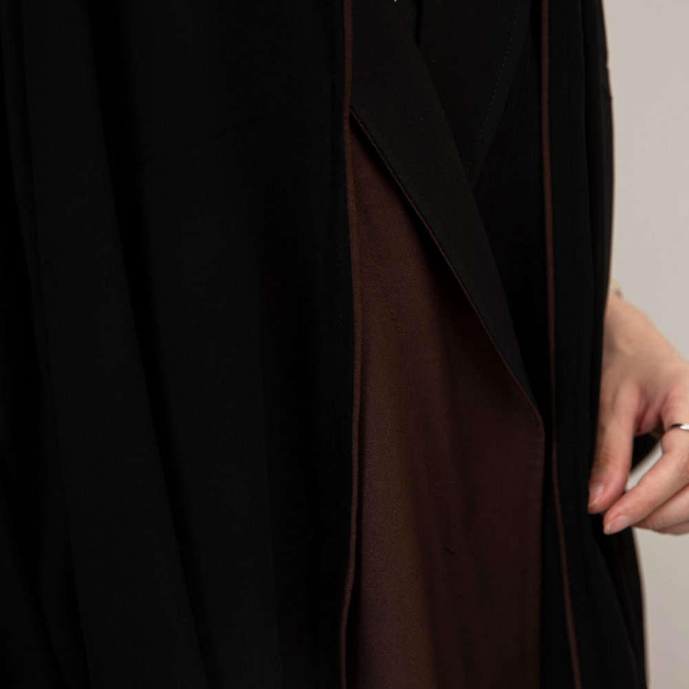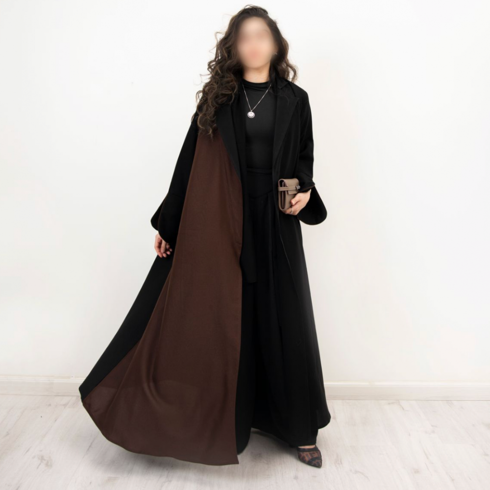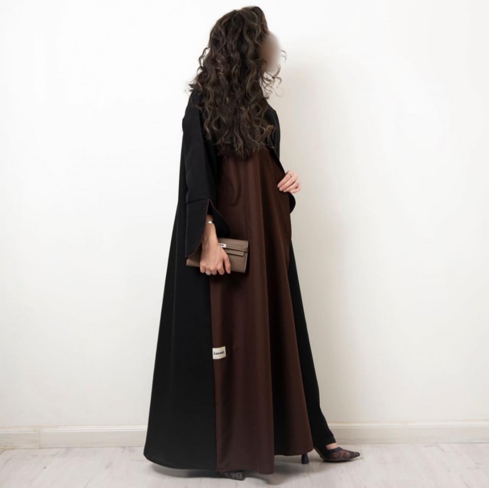 عبايه كتان اسود وبالامام كتان بني ، كلوش ولف ، فتحه بالكم . اطراف ب الكم و الطرحه .