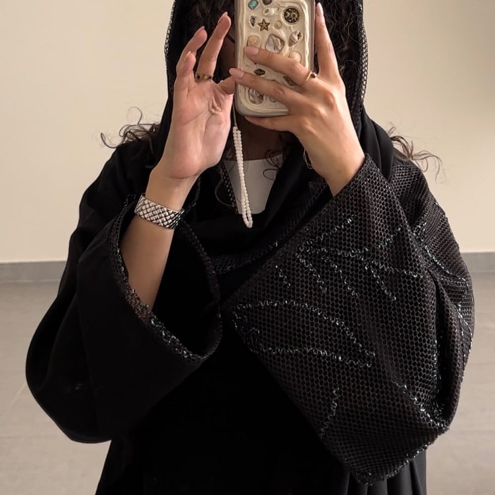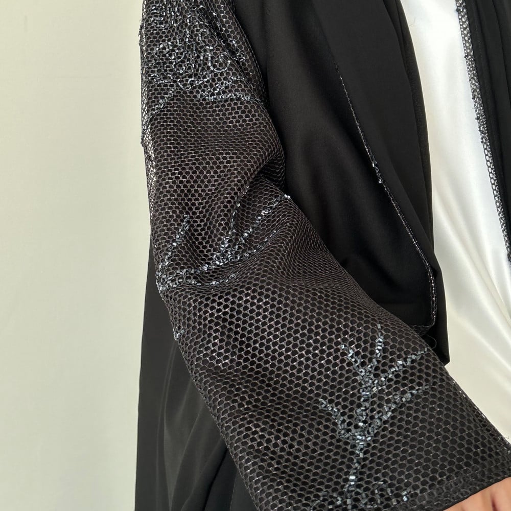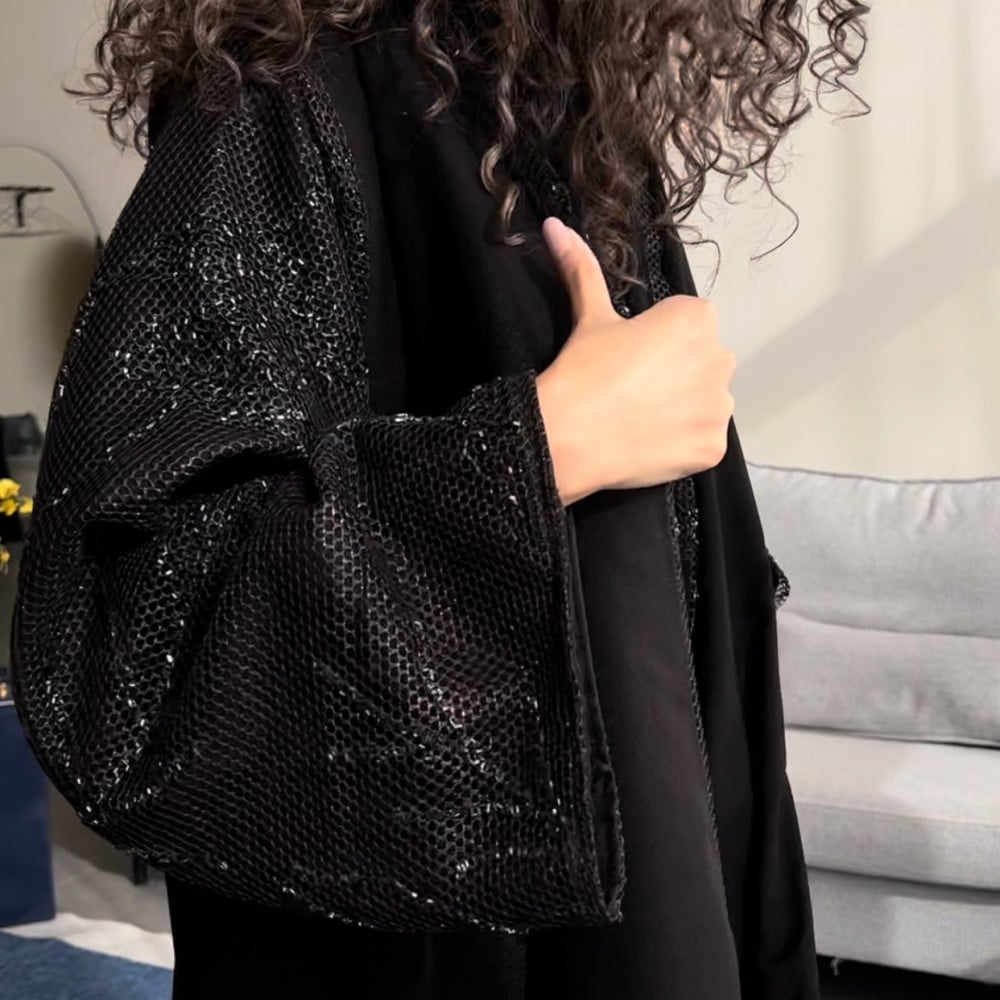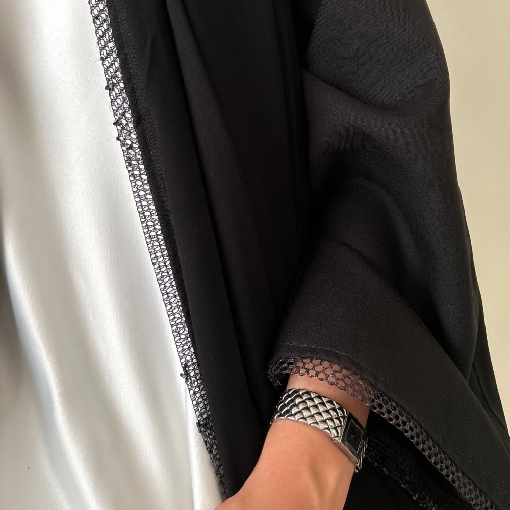 عبايه كتان اسود كلوش ، ب كم اليمين عليه قماش شك ، والجهه الثانيه ساده ، الشك بالامام و اطراف الطرحه