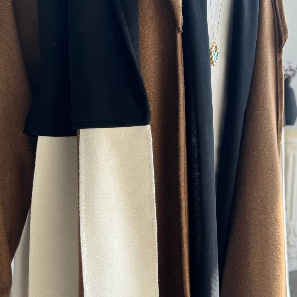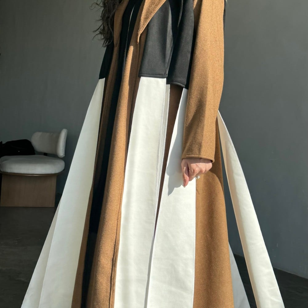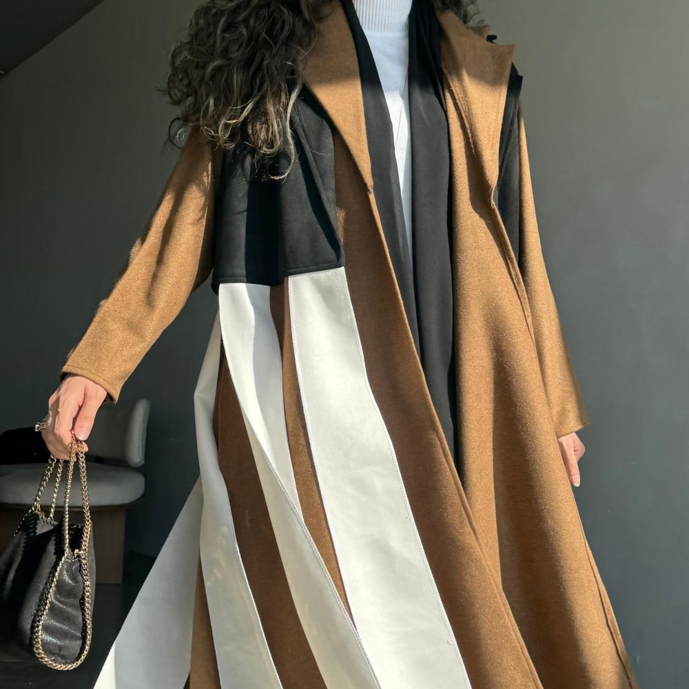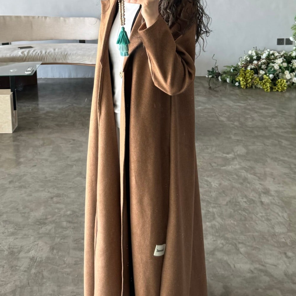 عباية قماش جوخ بني فاتح نص كلوش ، ب ياقه ، مع جاكيت اسود شامواه و اطراف قماش ابيض على الجاكيت