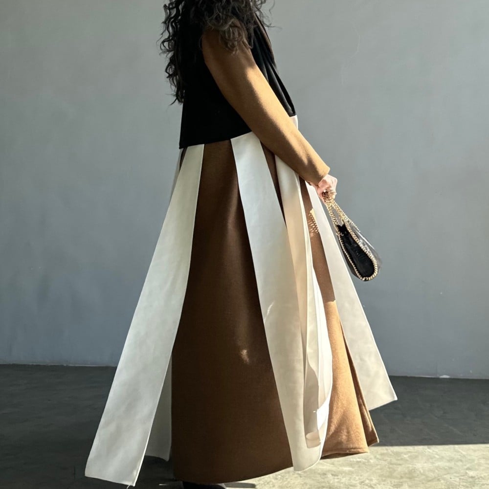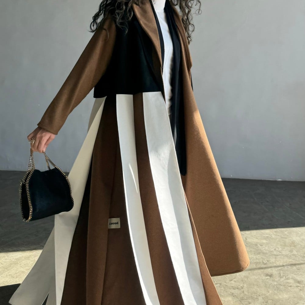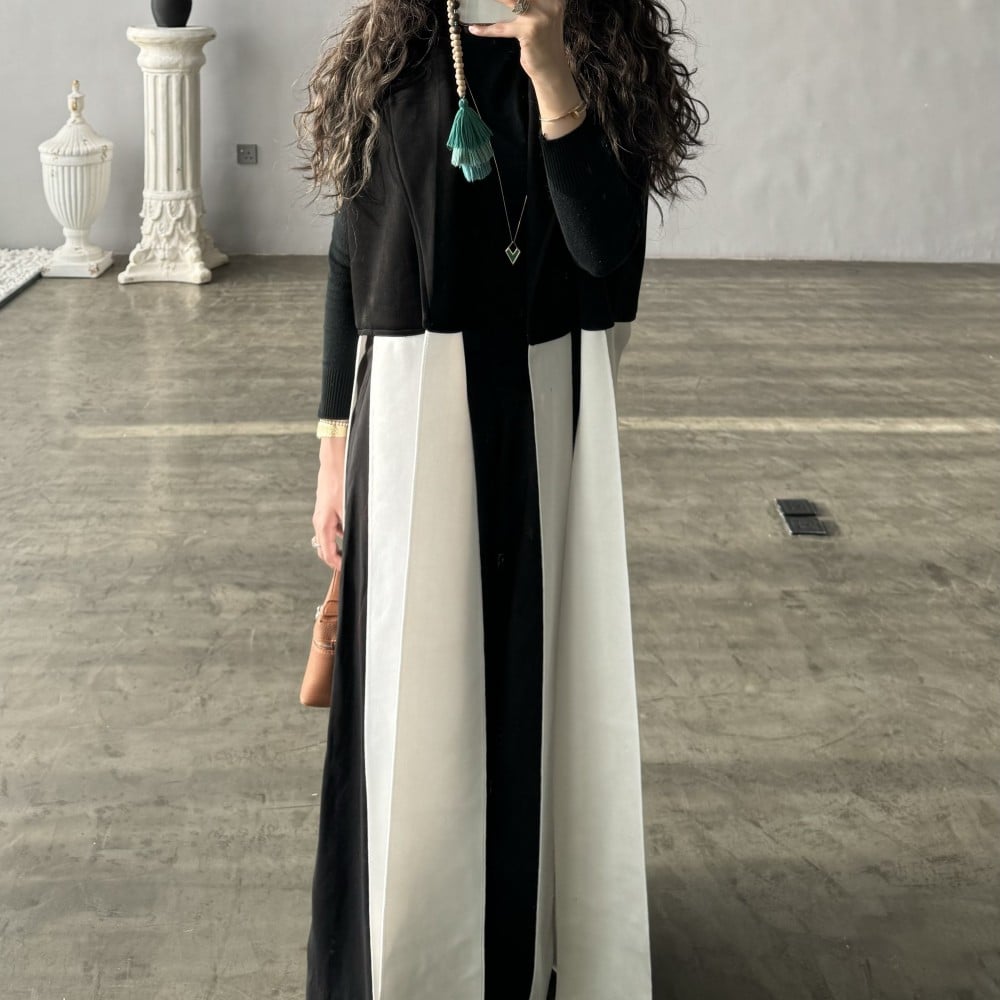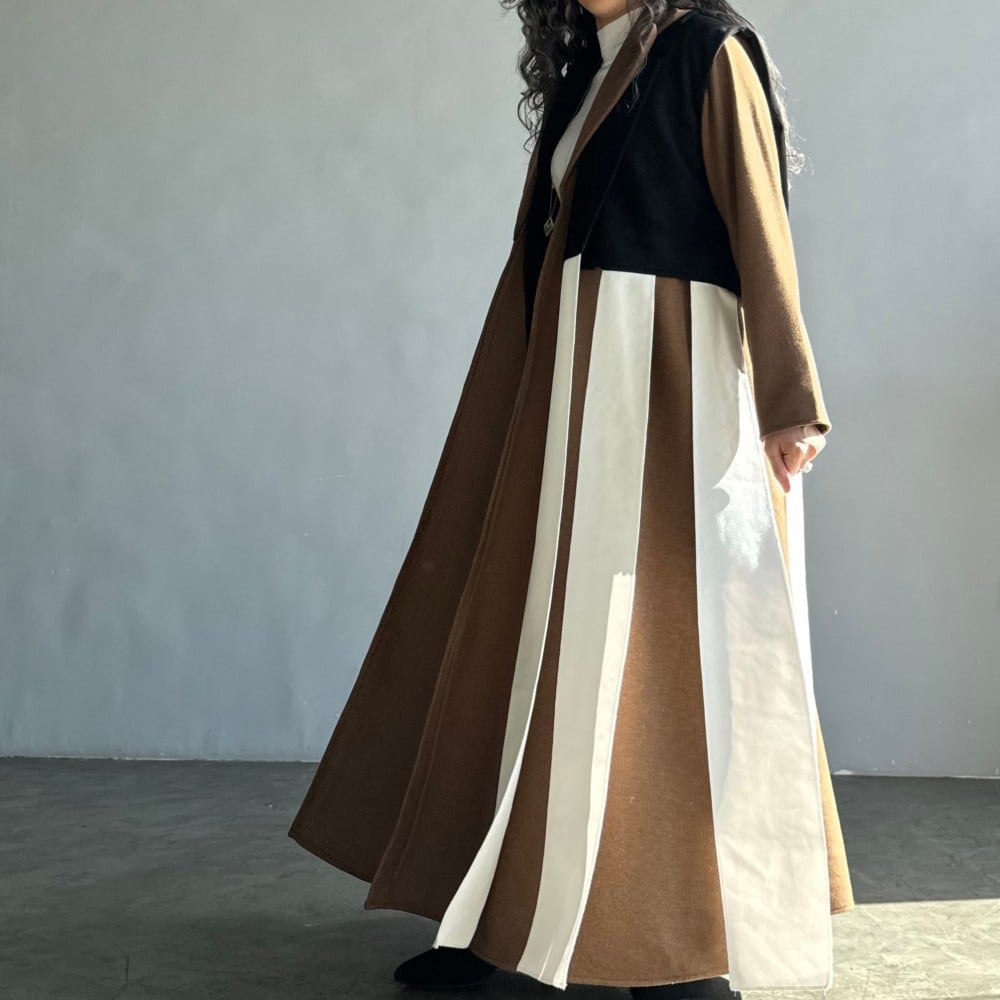 عباية قماش جوخ بني فاتح نص كلوش ، ب ياقه ، مع جاكيت اسود شامواه و اطراف قماش ابيض على الجاكيت