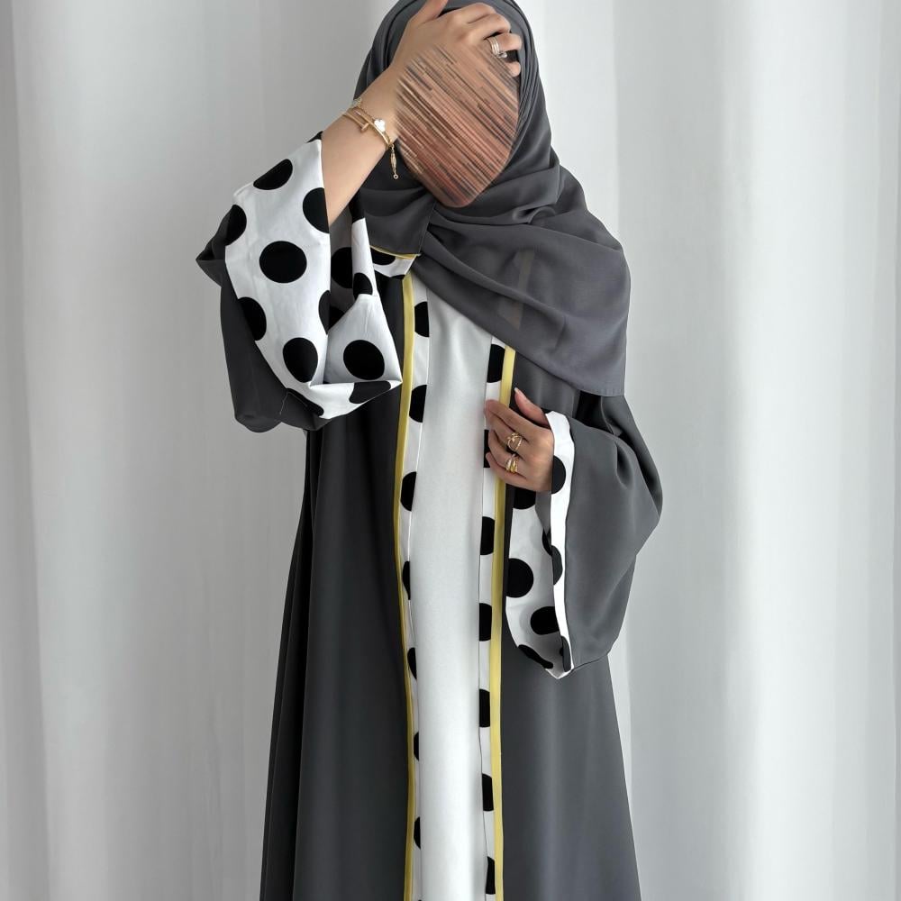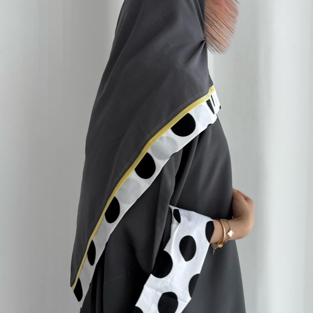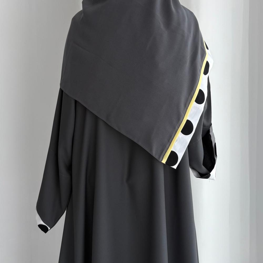 القماش: كريب، باكمام مبطنه بقماش قطن، باطراف صفرا شامل الطرحه القصه: كلوش اللون: رصاصي، اسودملاحظه: نأمل مراعاه عند الغسيل