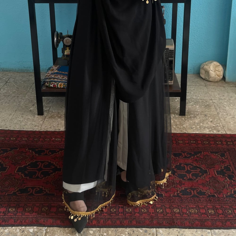 عبايه ياقه بكم مربع ، قماش حرير اسود مبطن ب بتل اسود ومن الاكمام كلفه قمور ذهبيه ومن تحت العبايه بالكامل ، ب طرحه اطراف كلفه ذهبيه