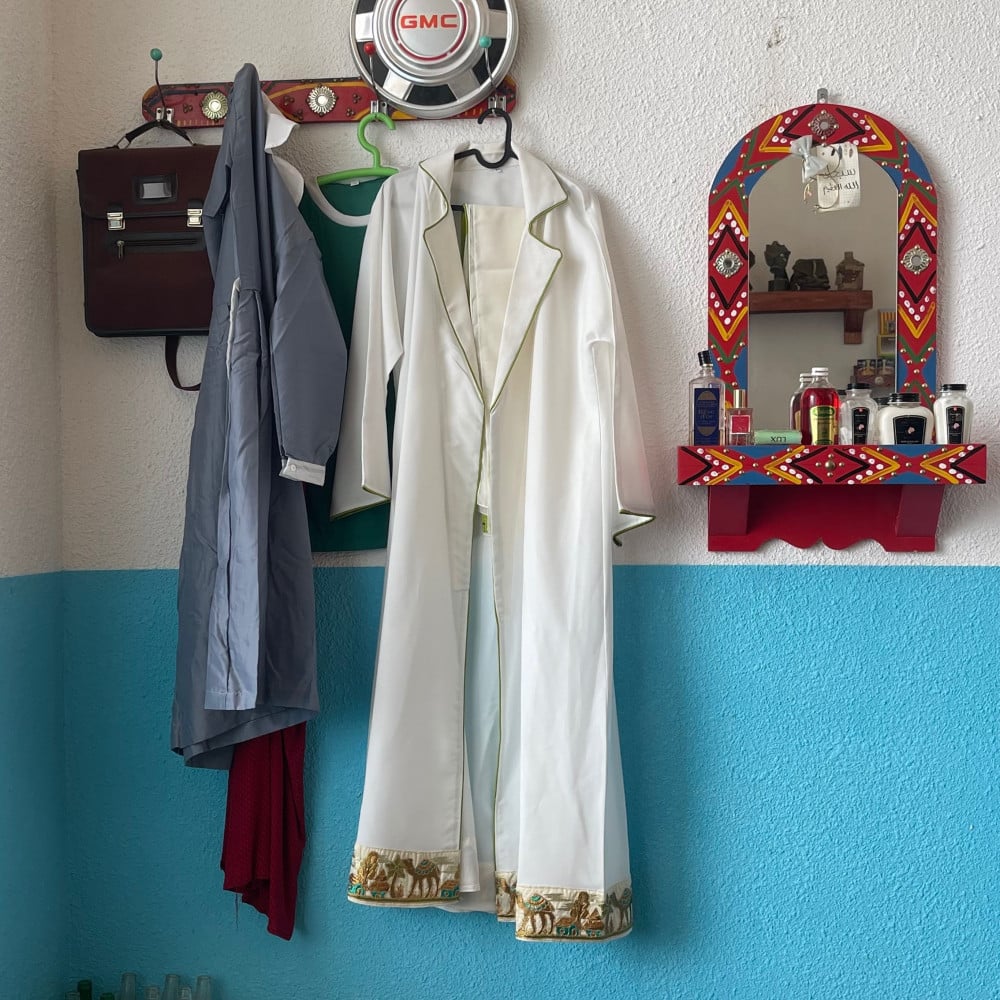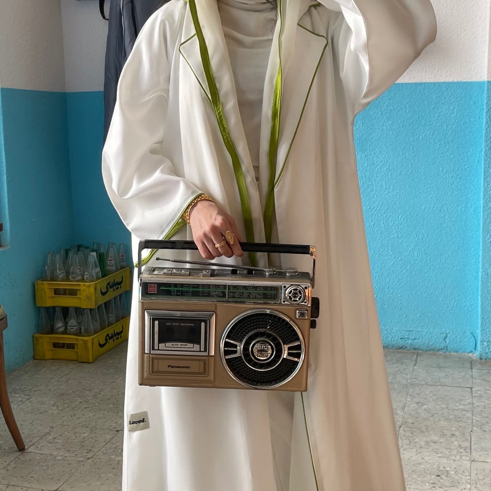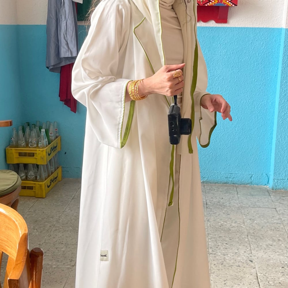 عبايه باللون الابيض بياقه و اطراف قماش ، شامل الطرحه باطراف ، كم مربع و كلفه من تحت العبايه باللون الاوف وايت