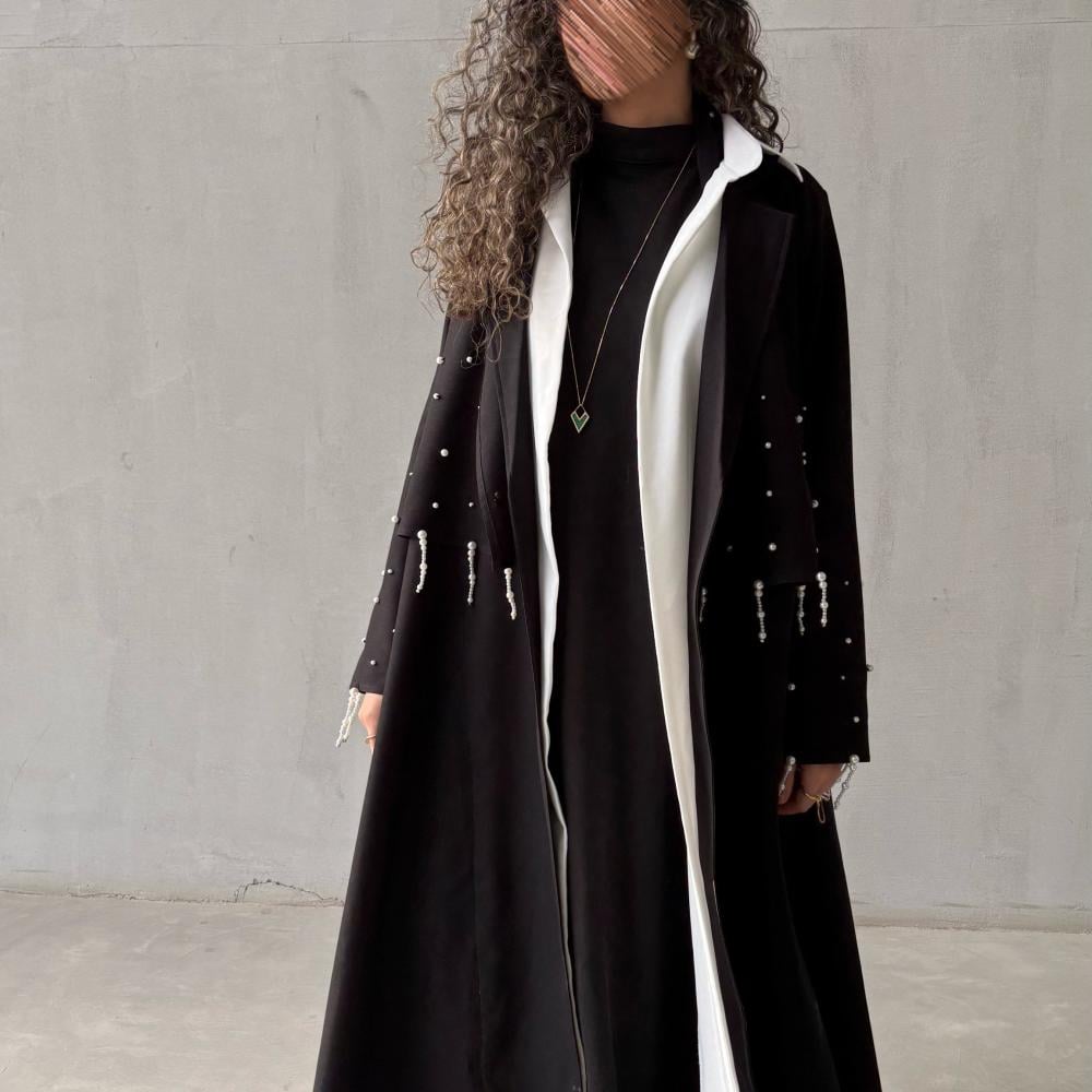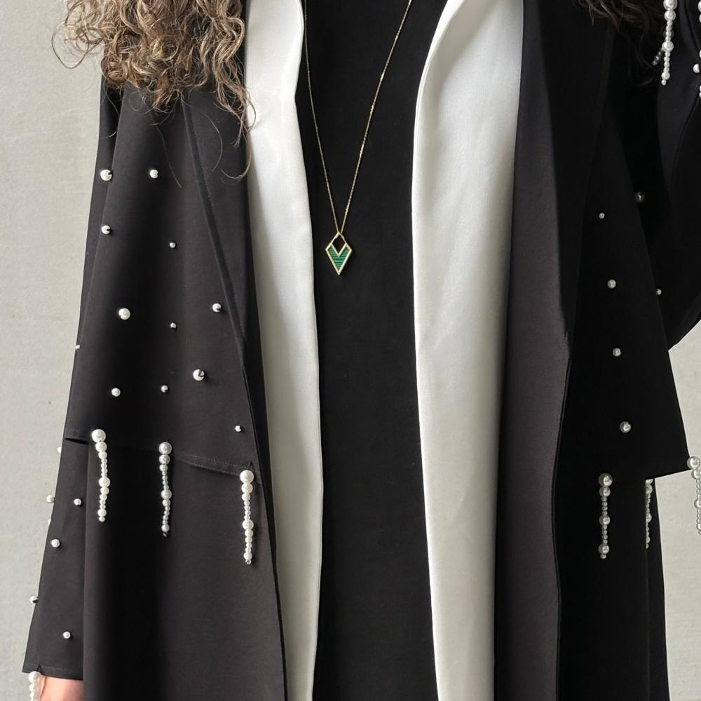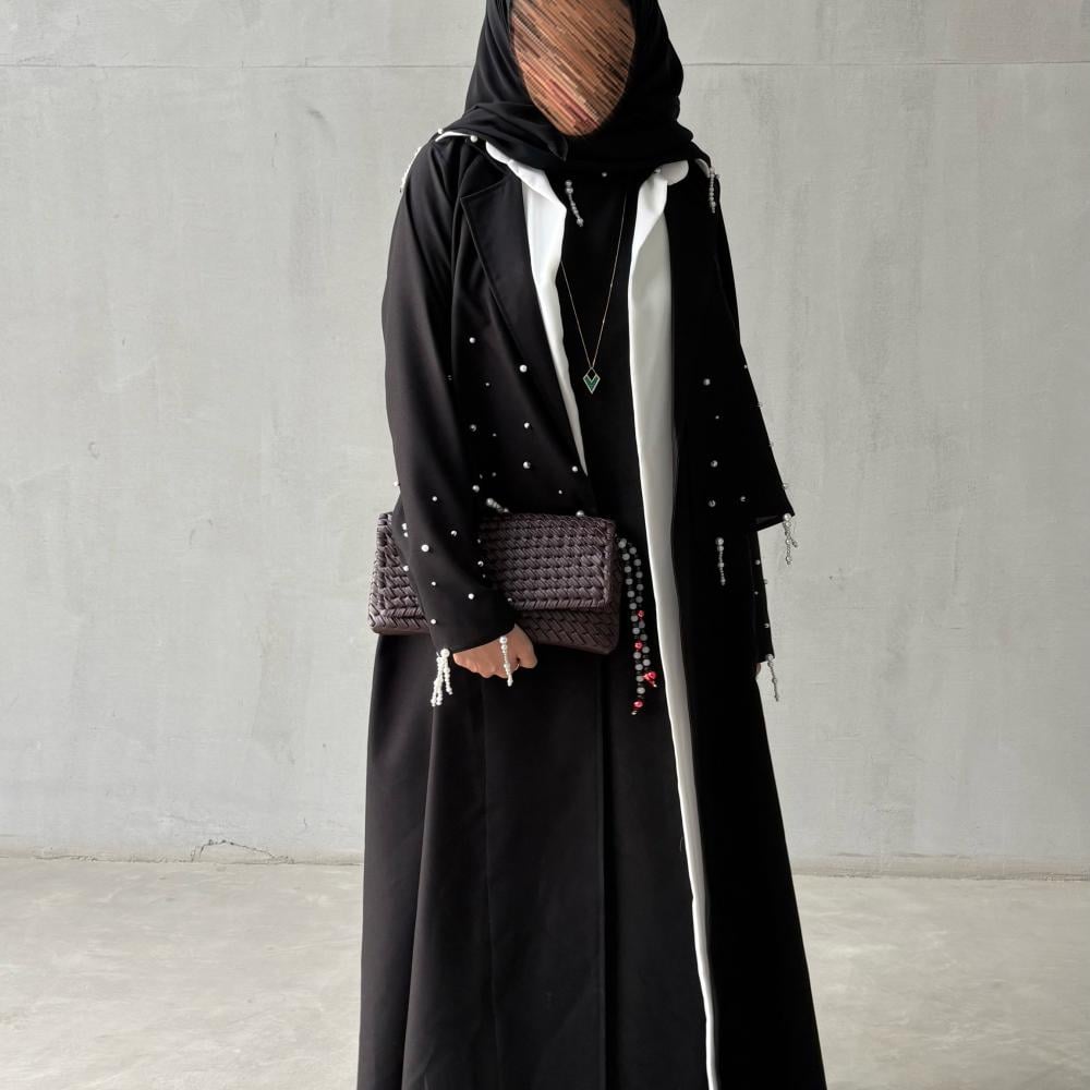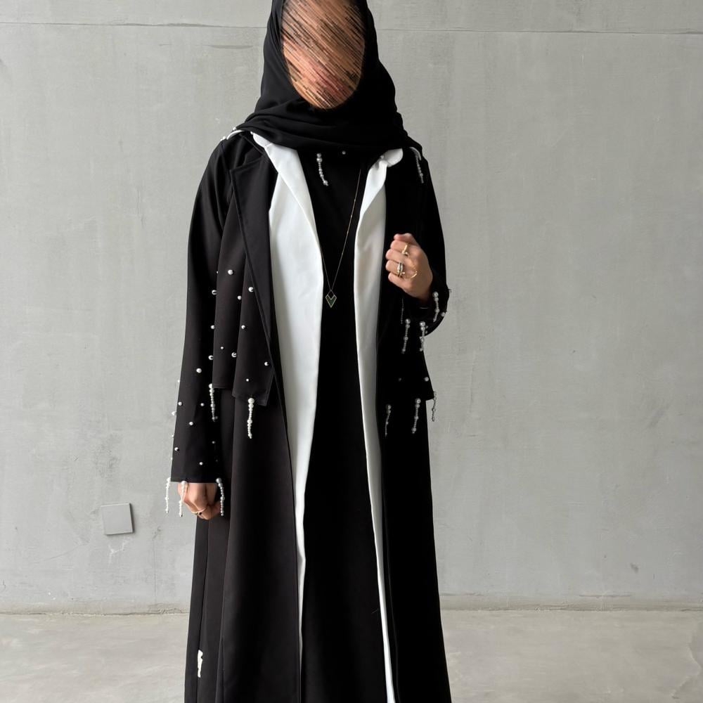 عبايه كتان اسود كلوش ب ياقه وقطعه بيضاء بالامام وجاكيت واكمام شك لولو شامل الطرحه اطراف لولو