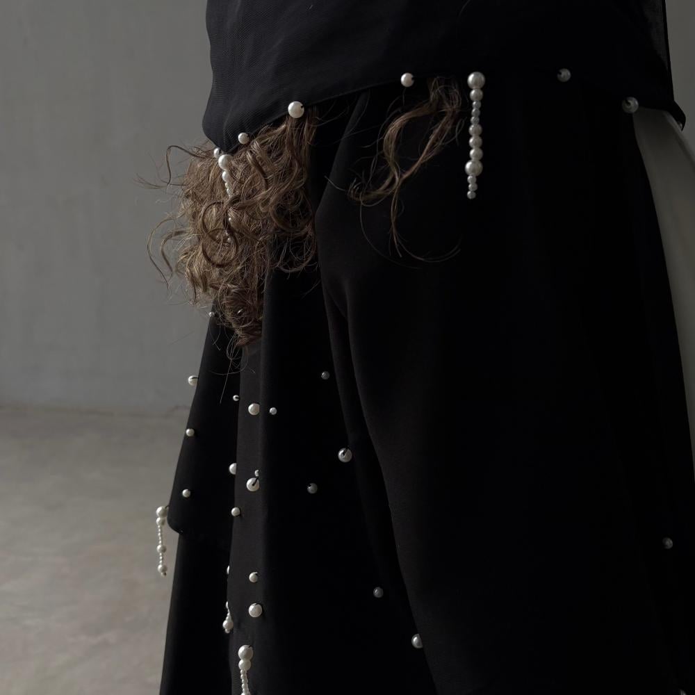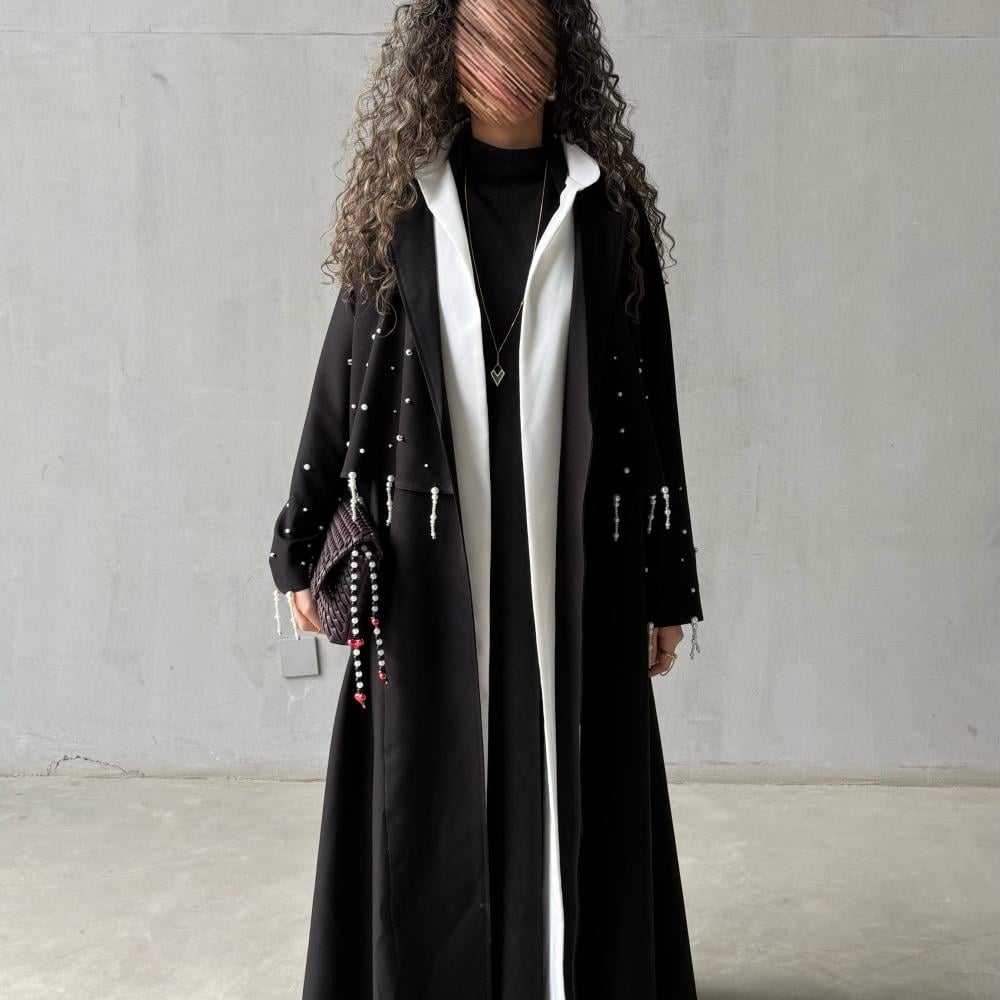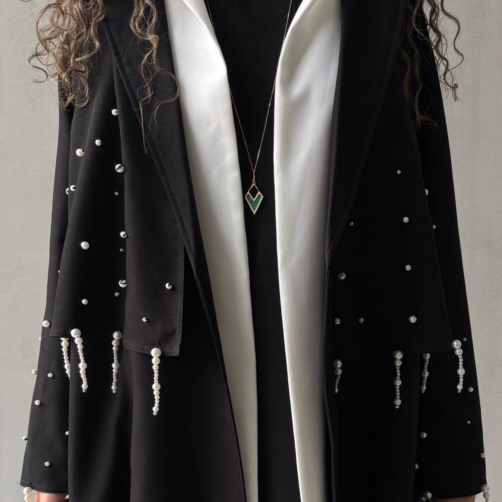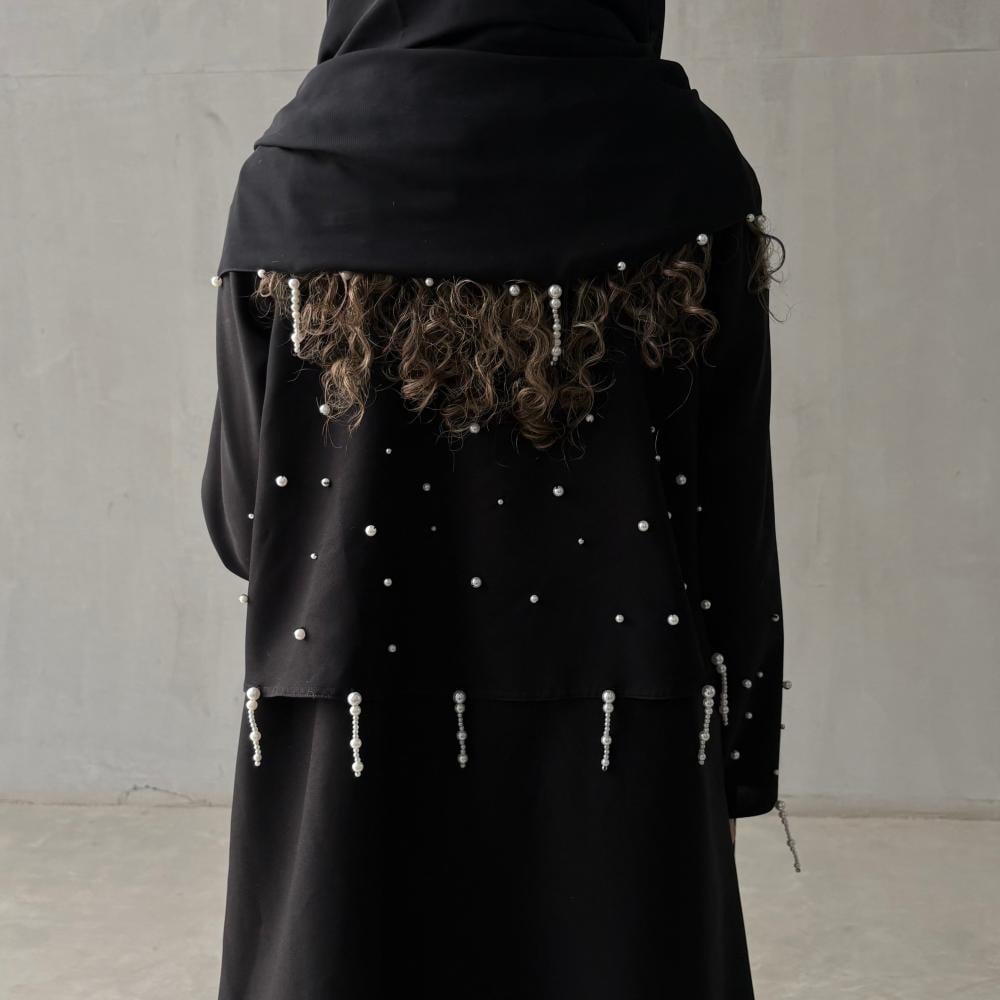عبايه كتان اسود كلوش ب ياقه وقطعه بيضاء بالامام وجاكيت واكمام شك لولو شامل الطرحه اطراف لولو