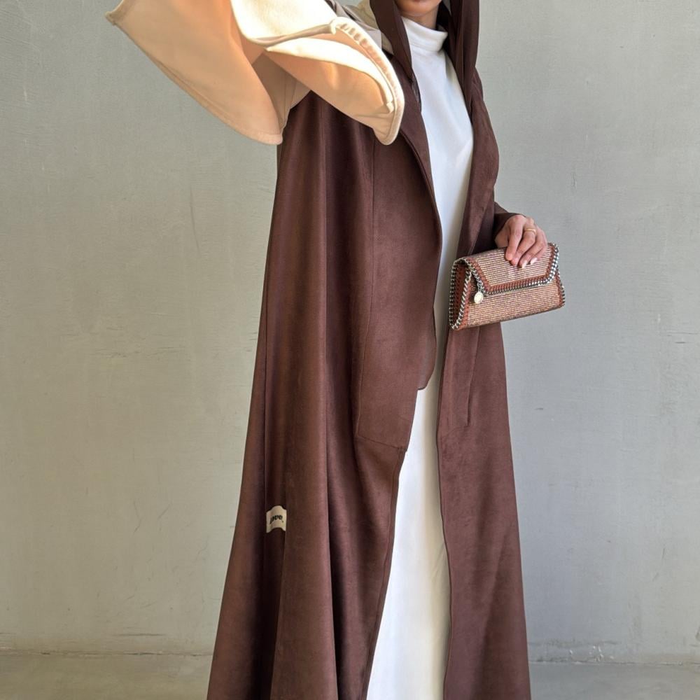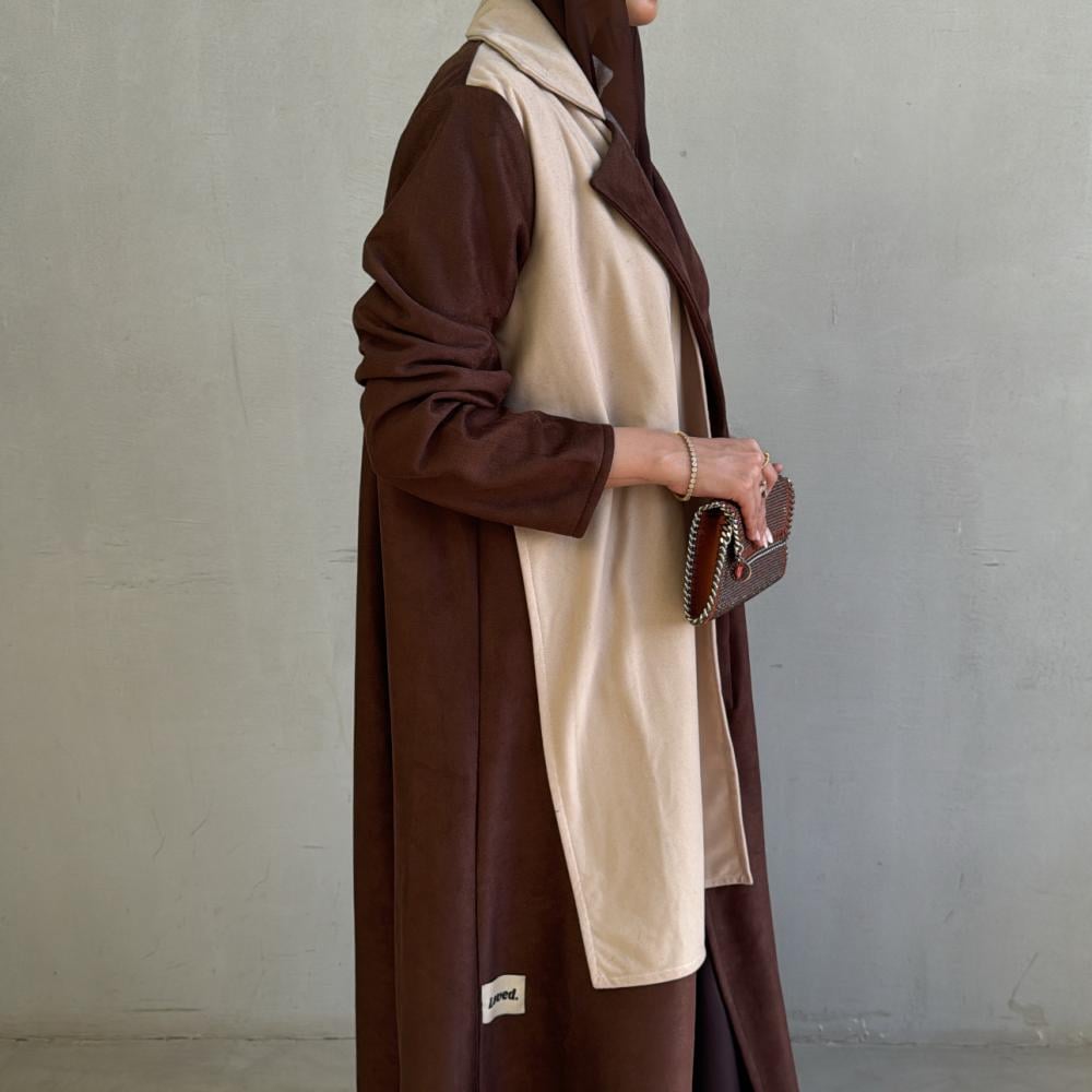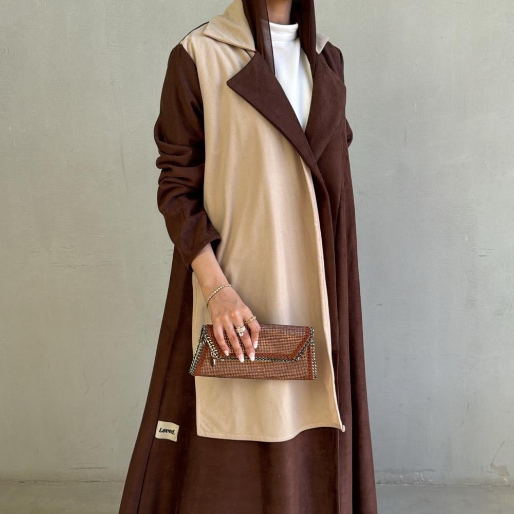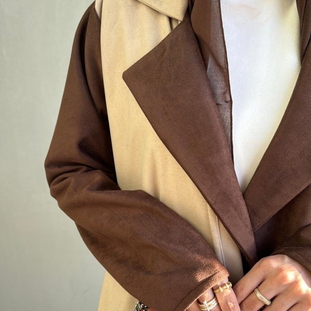 عبايه شامواه بني كلوش بياقه نص بيج ونص بني ، شال قصير نص العبايه بيج