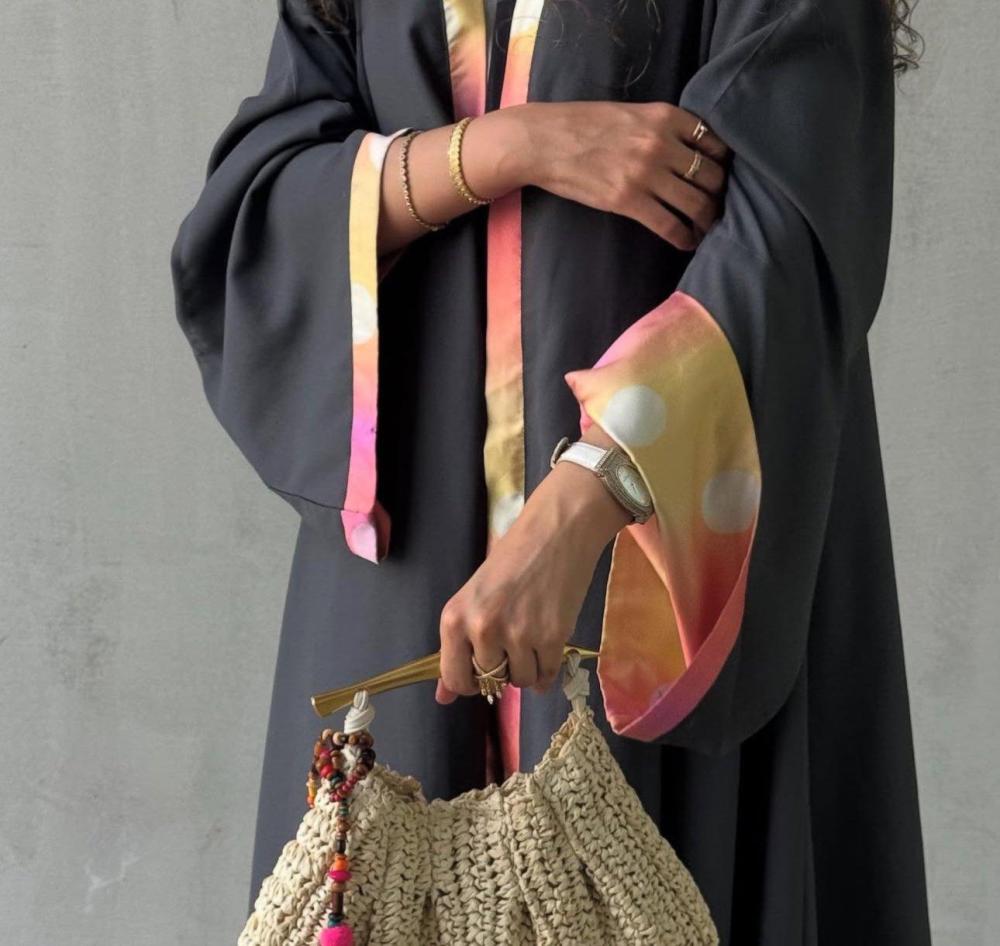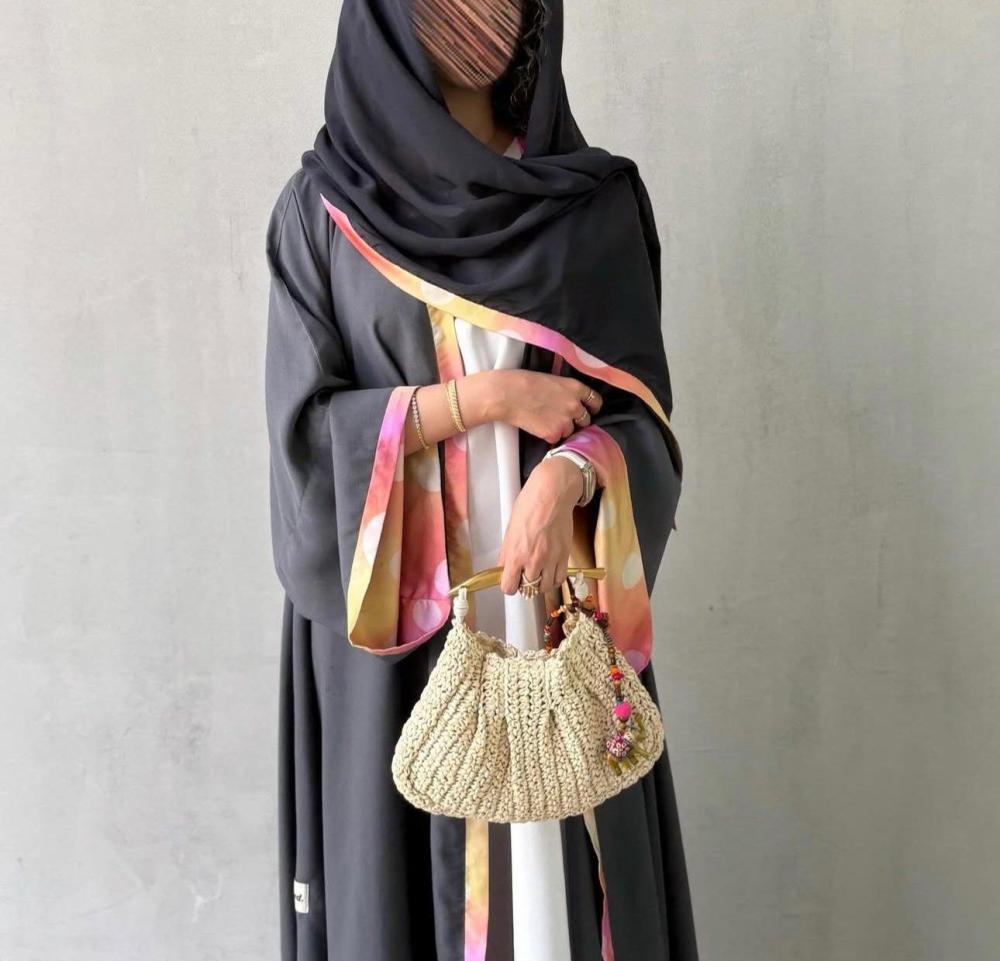 عبايه كلوش كريب رصاصي بأطراف ملونه واكمام طويله بقماش ملون من الداخل ، شامل الطرحه رصاصي باطراف ملونهنأمل مراعاه العبايه بالغسيل
