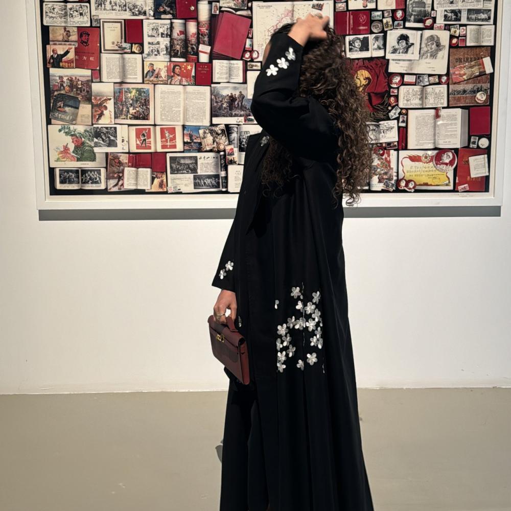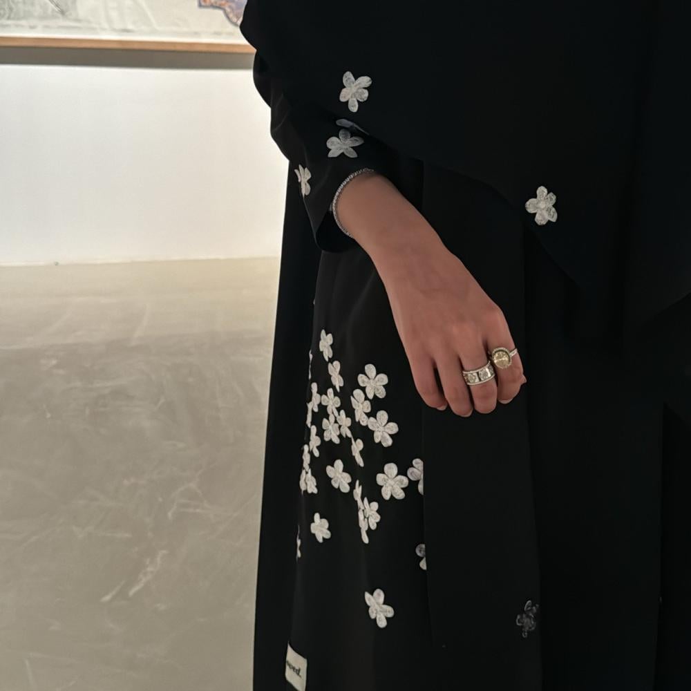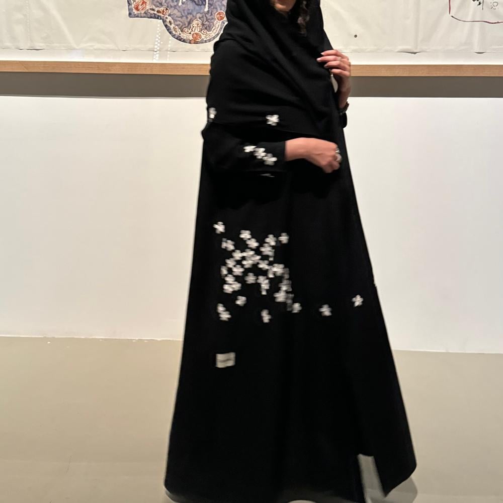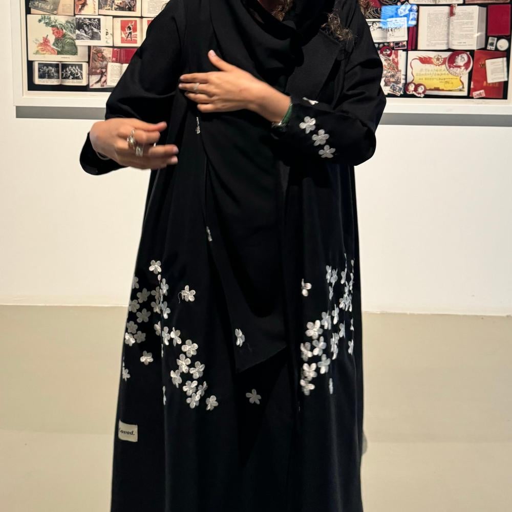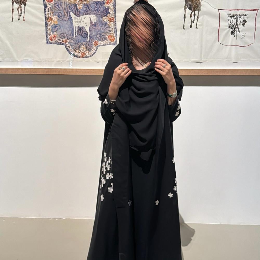 عبايه قصه كلوش ب ياقه ، كتان اسود مطرز ورود صغيره بالابيض من الامام و بدايه الاكمام و اطراف الطرحه .