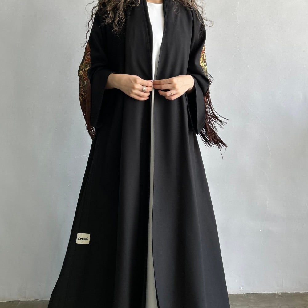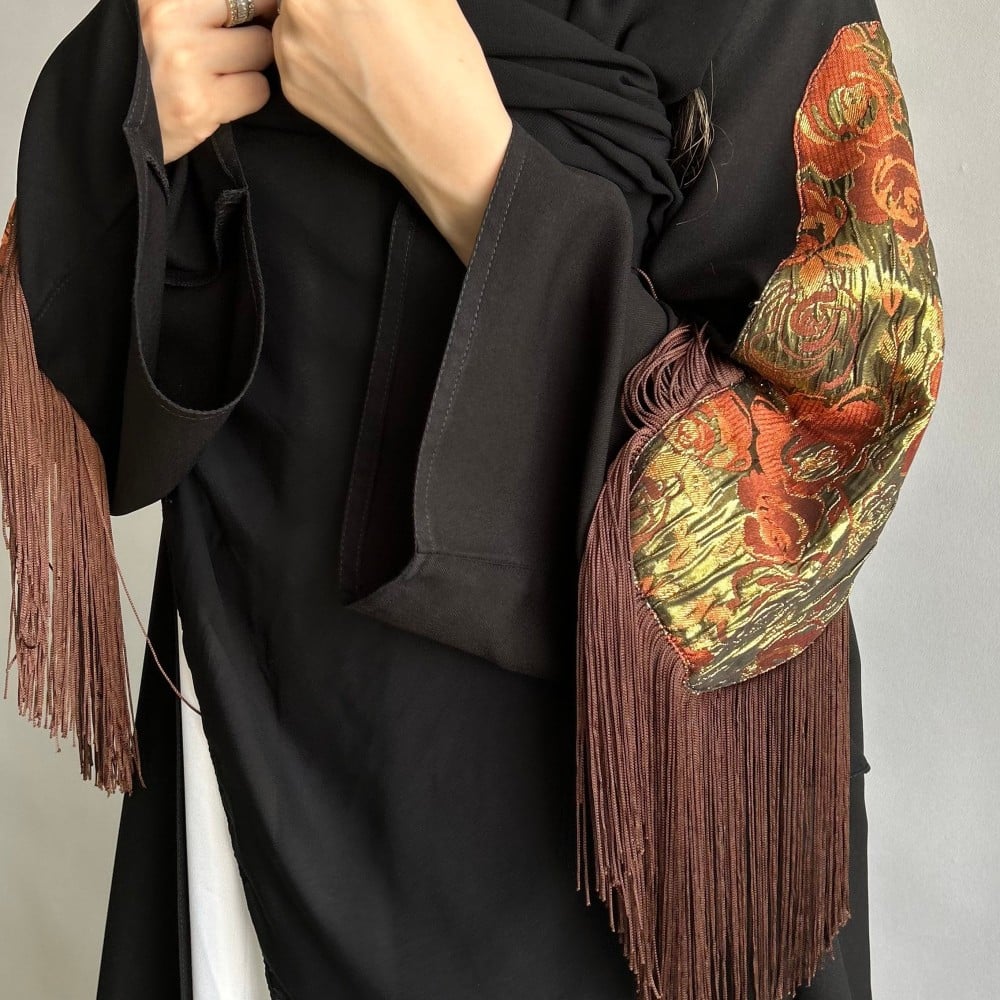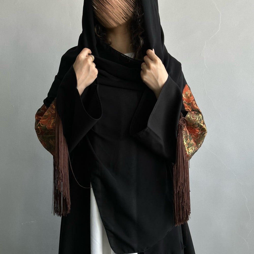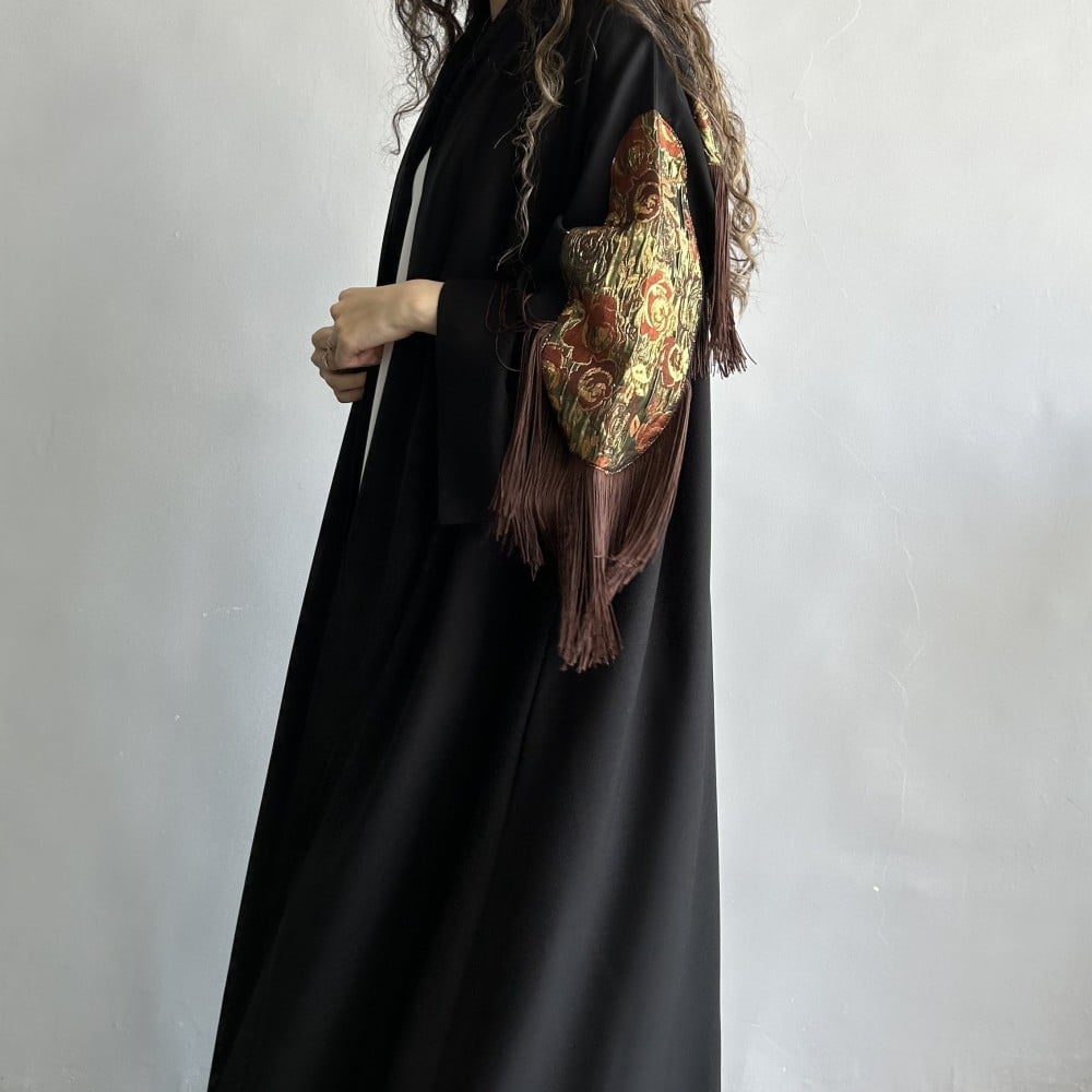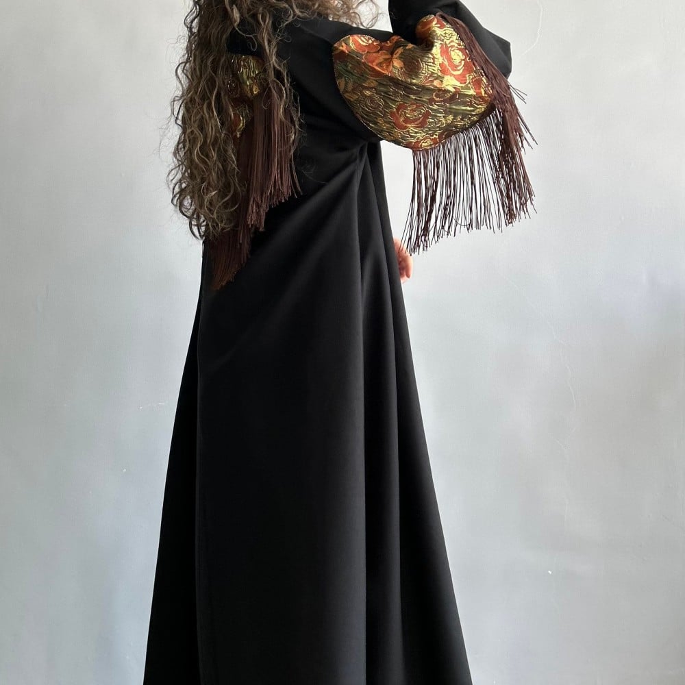 عبايه كتان اسود كلوش بياقه ، وقماش خيش ذهبي شامل الطرحه باذراف خيش