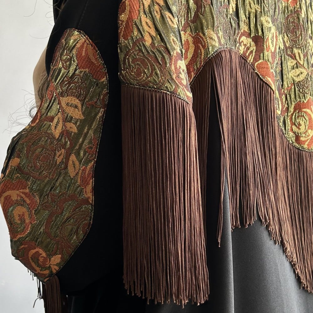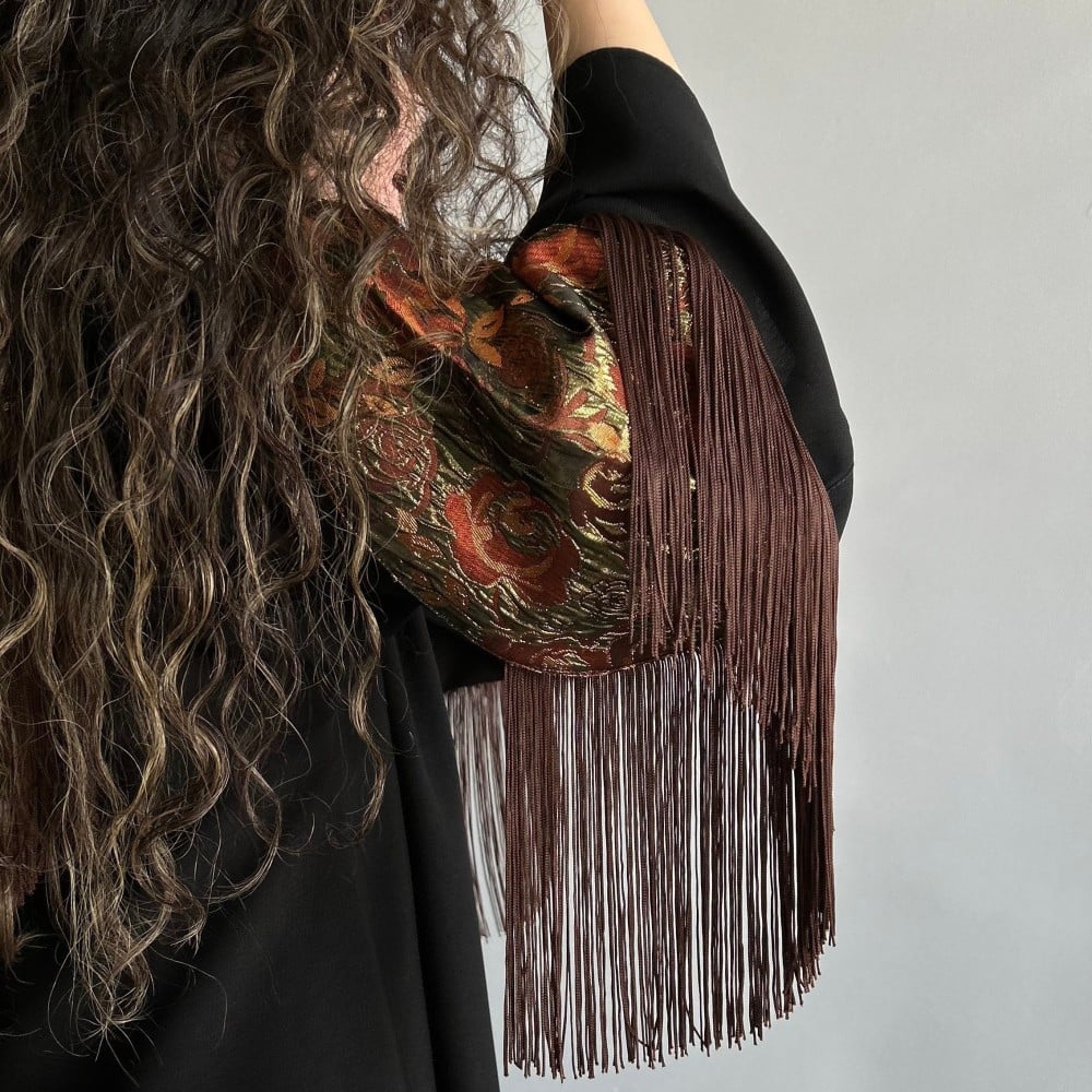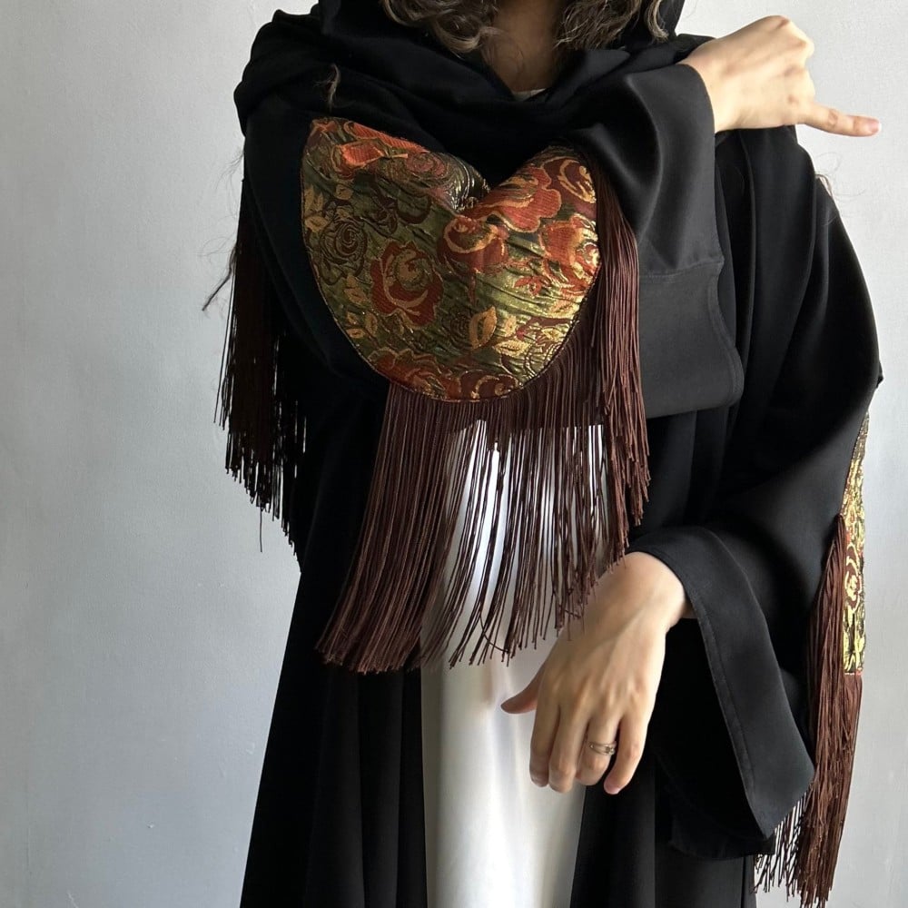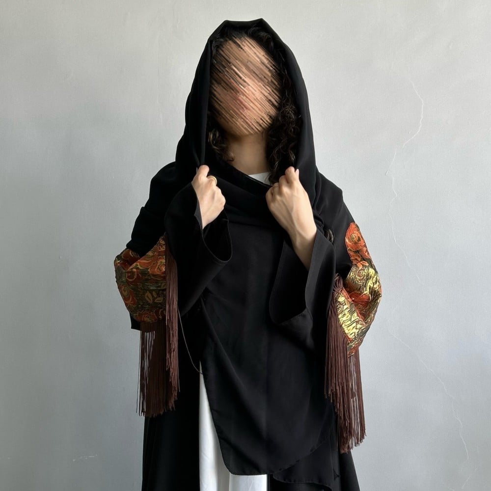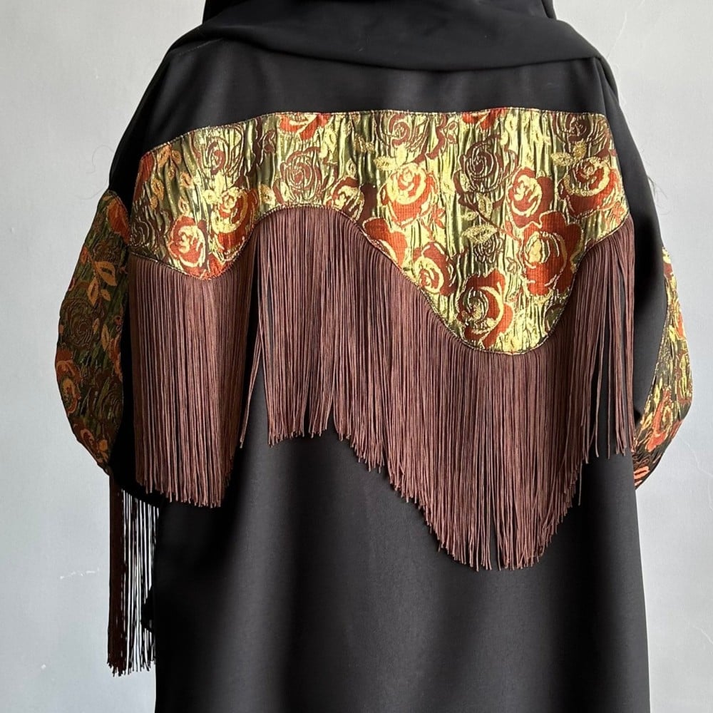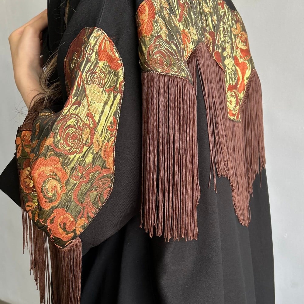 عبايه كتان اسود كلوش بياقه ، وقماش خيش ذهبي شامل الطرحه باذراف خيش