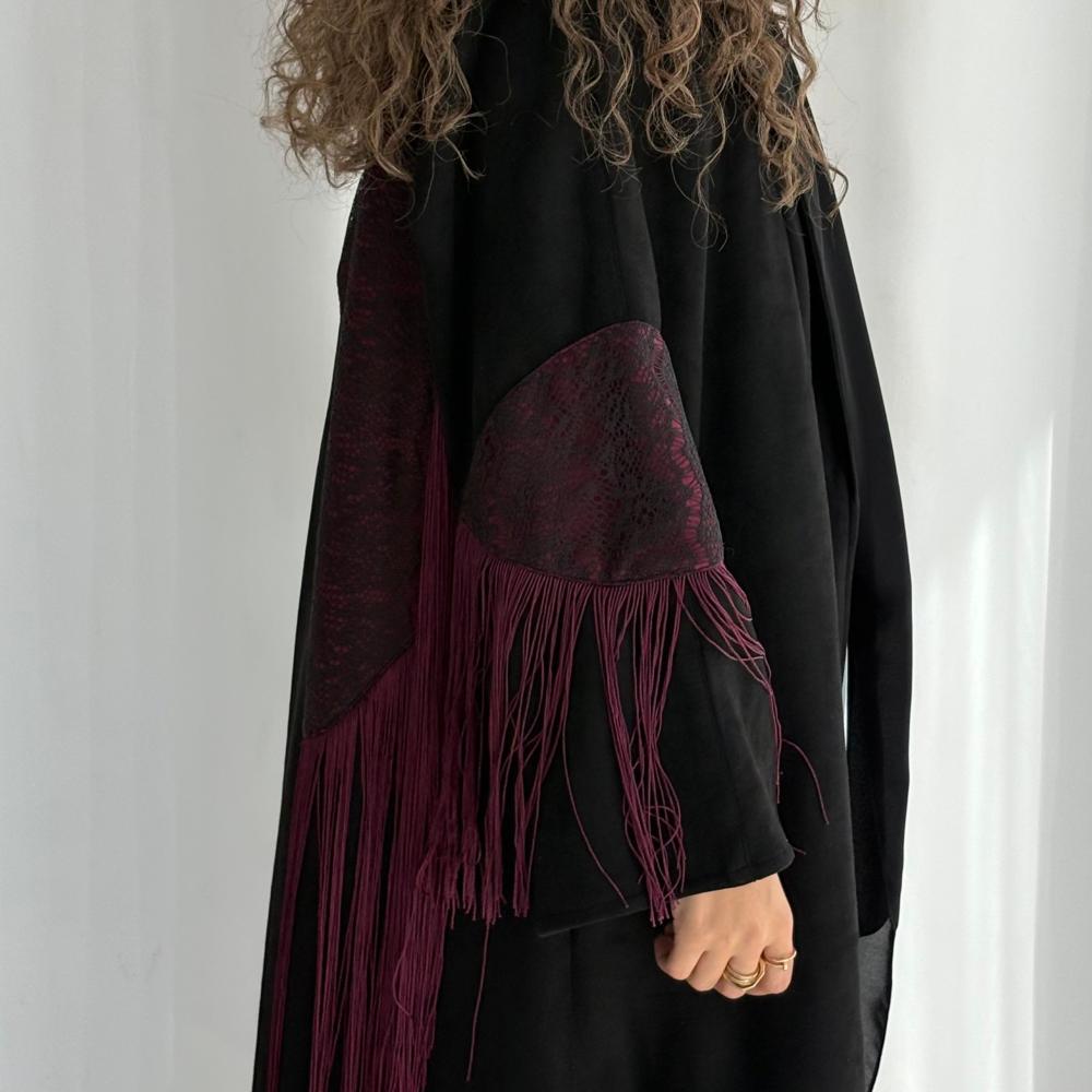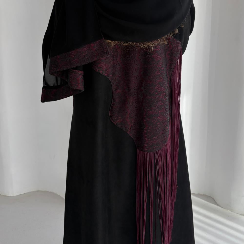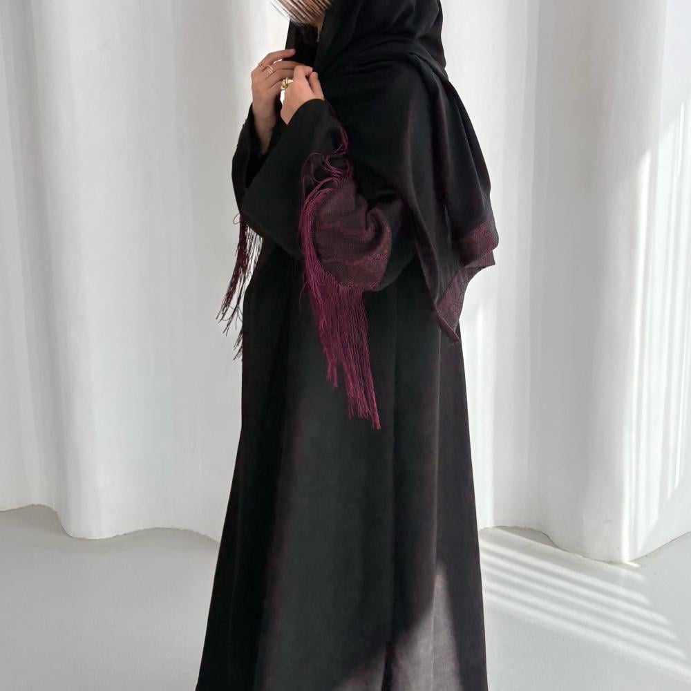 شامواه اسود كلوش مع دانتيل وهدب عنابي بالاكمام ومن ورا العبايه ، شامل الطرحهنأمل مراعاه العبايه بالغسيل
