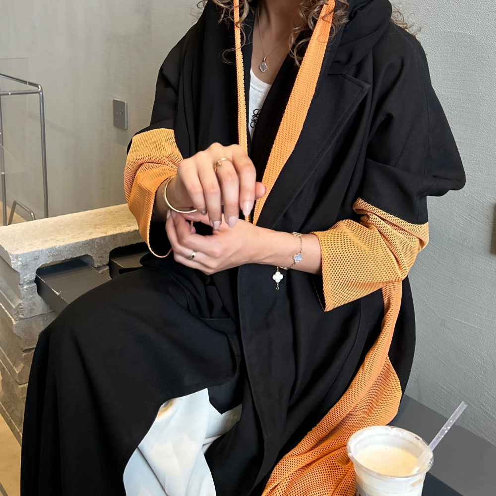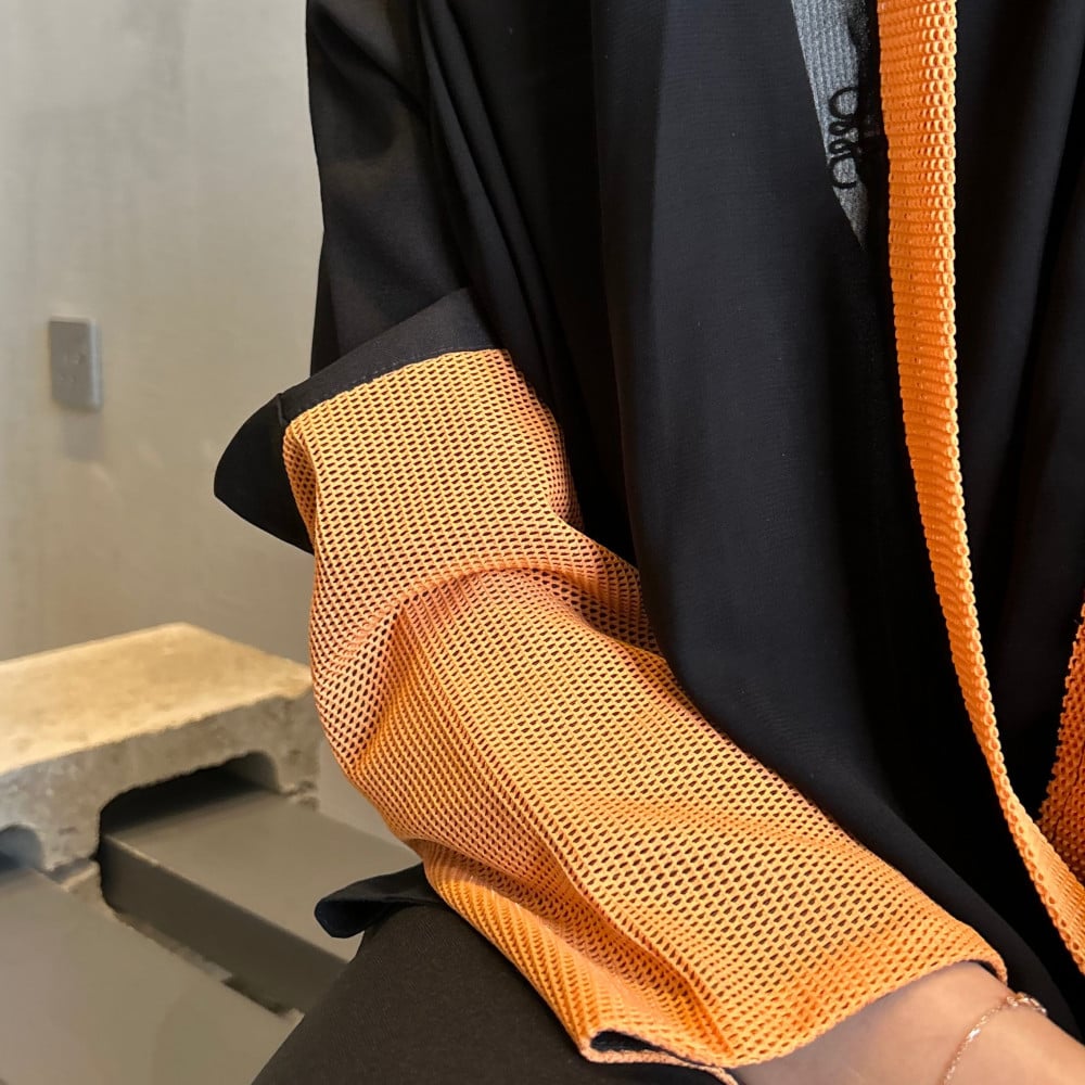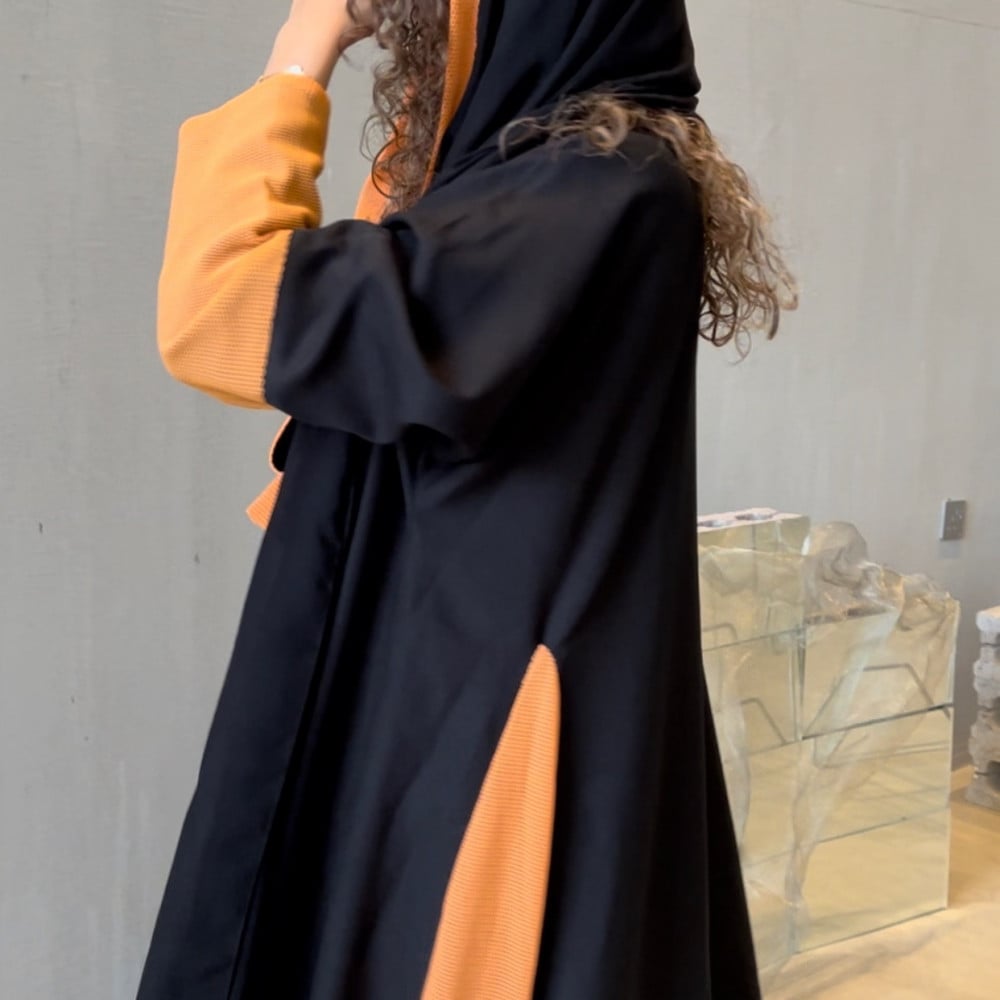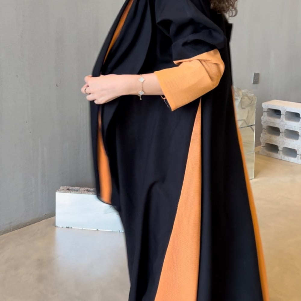 عبايه كتان اسود بياقه وقصة كلوش ،و اطراف من الجنبين باللون البرتقالي و بنهاية الاكمام ، شامل الطرحه باطراف برتقالي