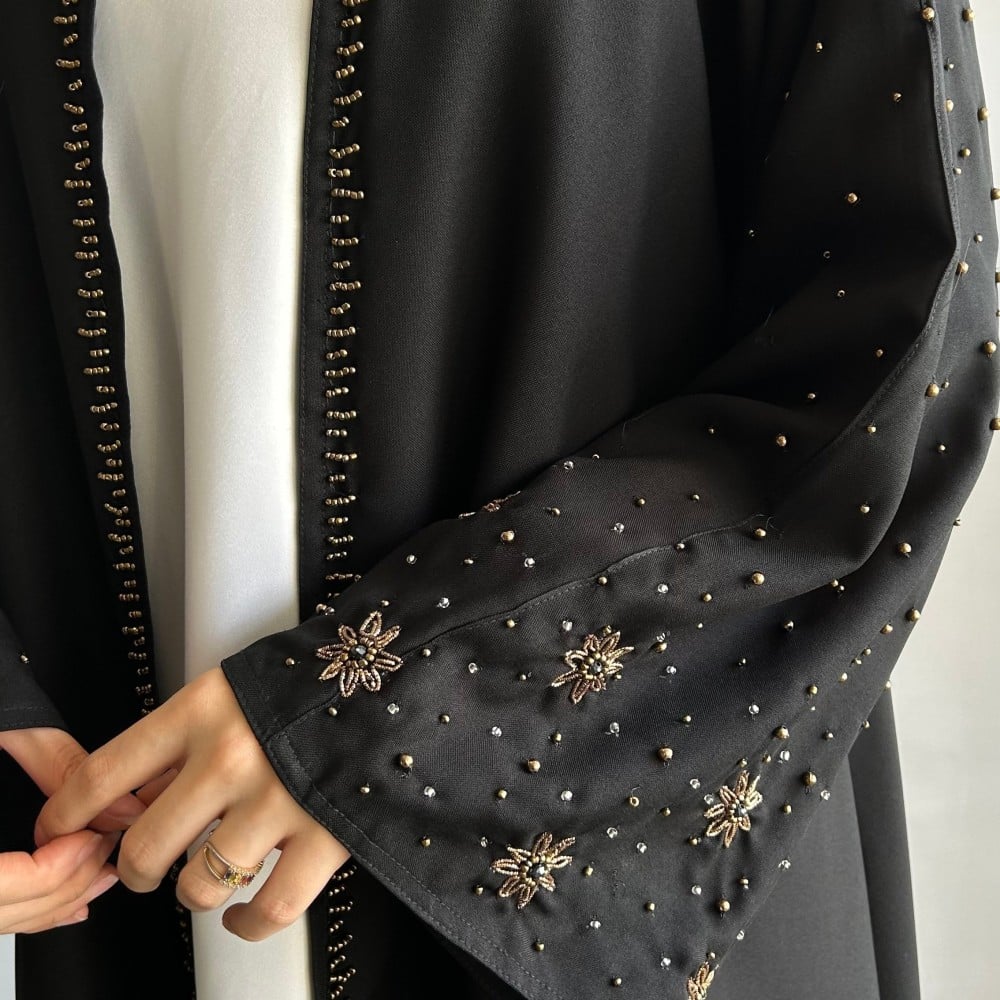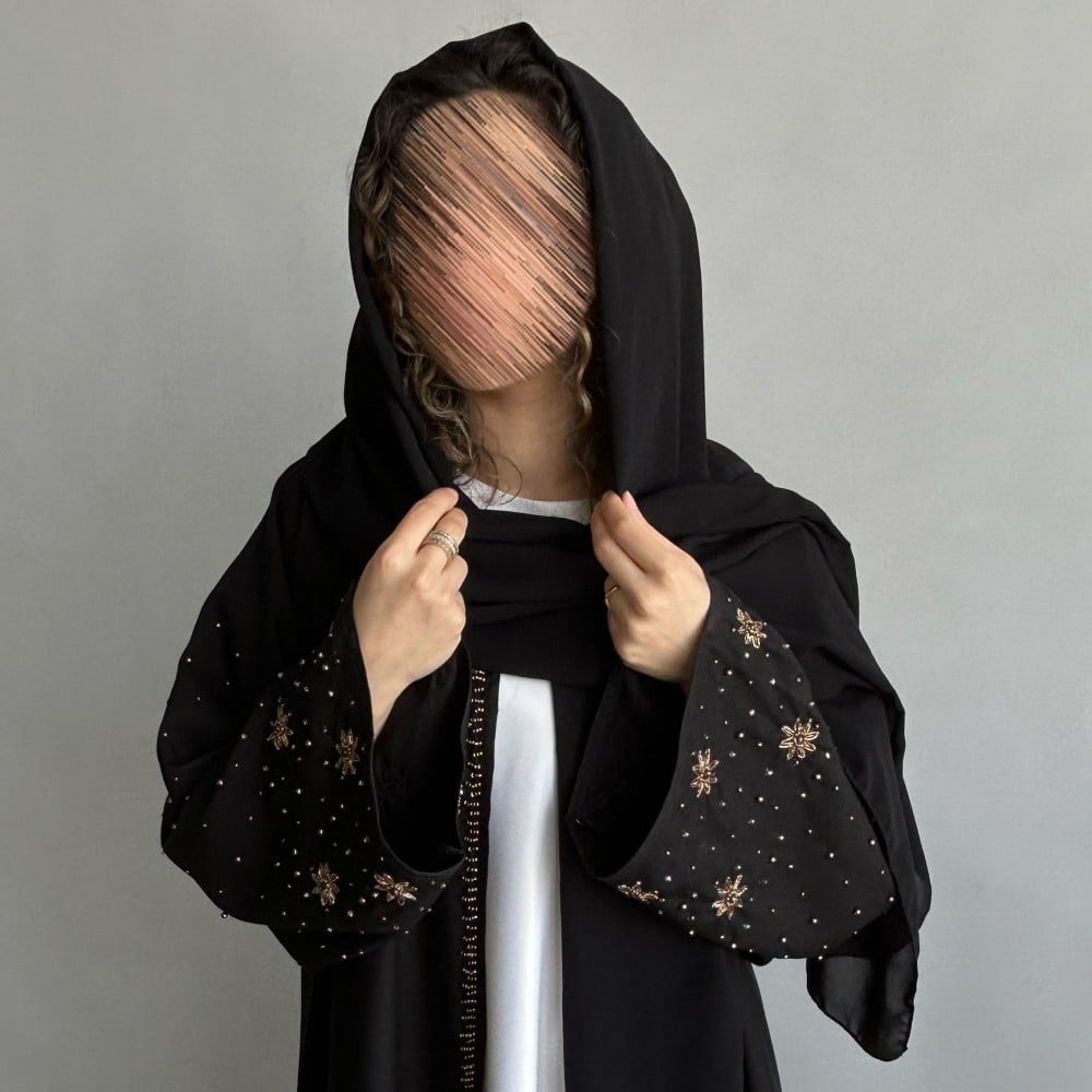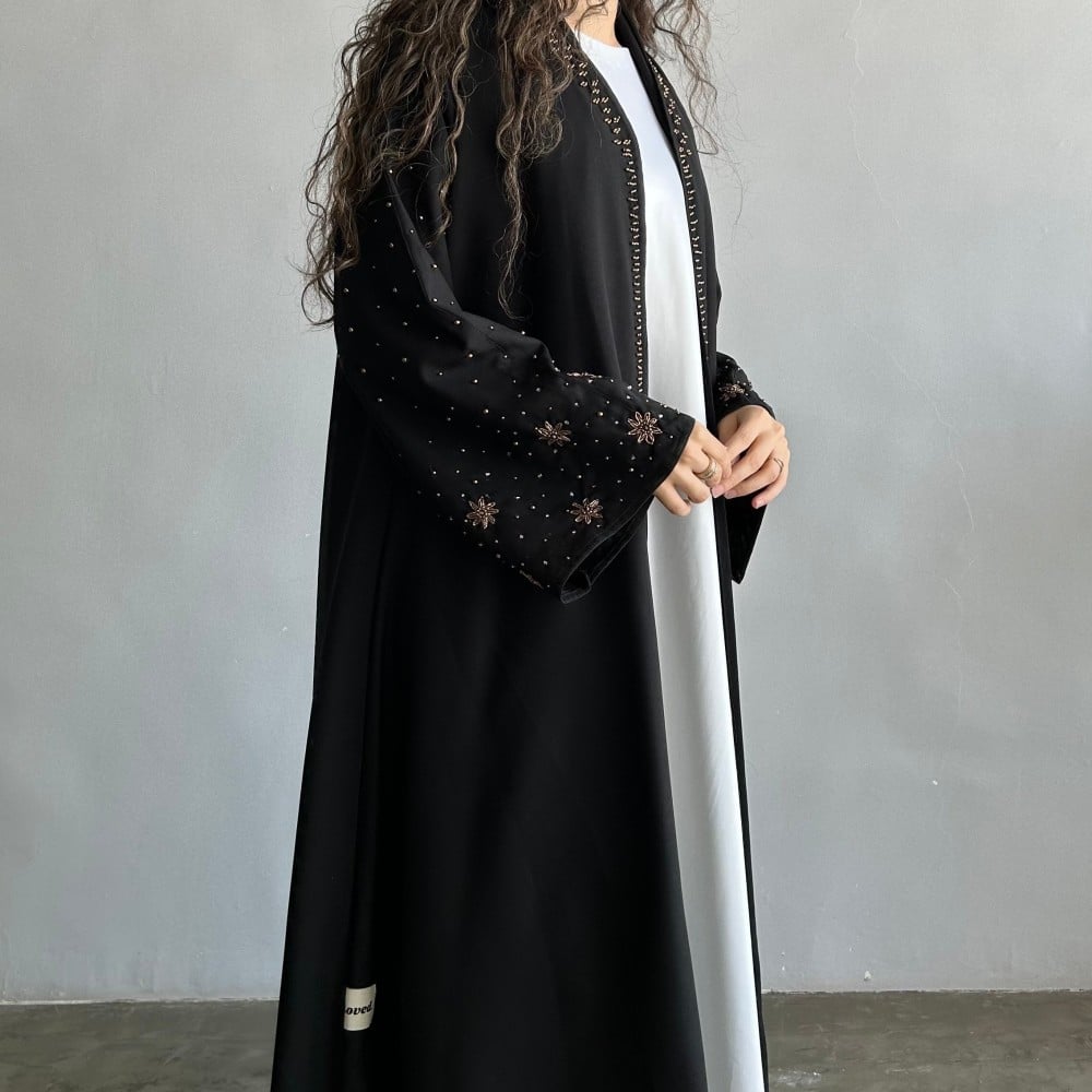 عبايه كتان اسود كلوش بياقه ، وقماش خيش ذهبي شامل الطرحه باذراف خيش
