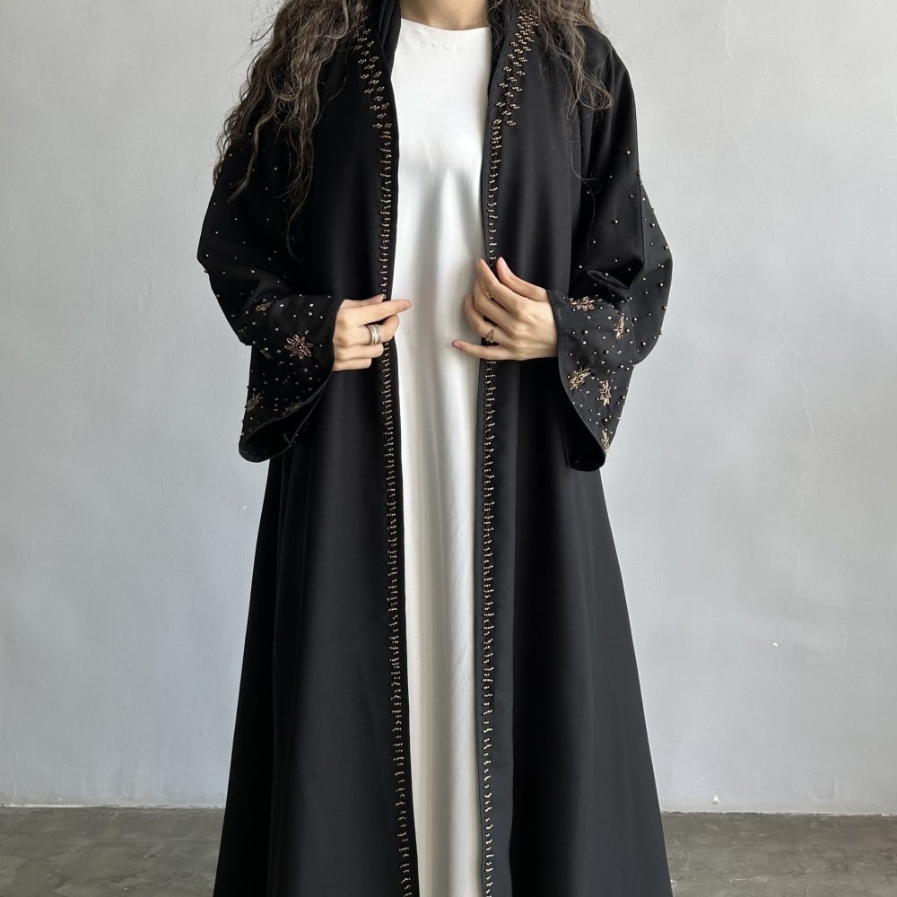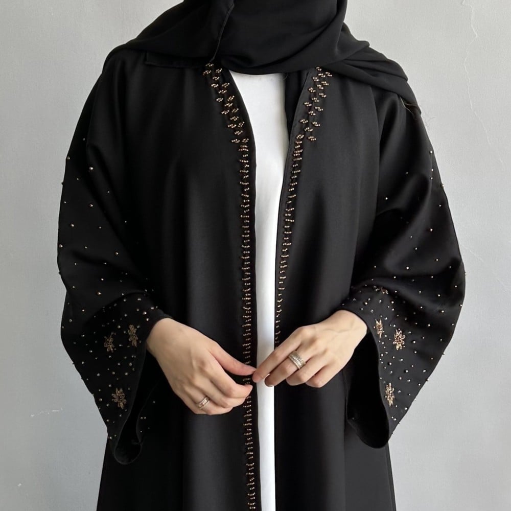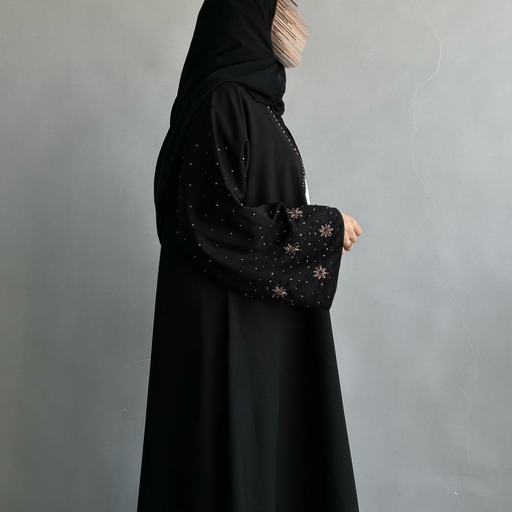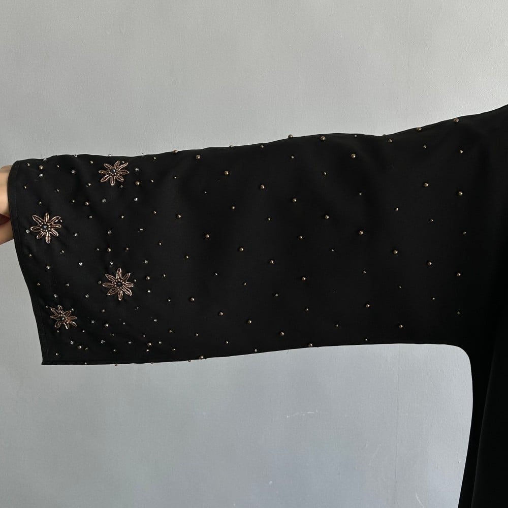 عبايه كتان اسود كلوش بياقه ، وقماش خيش ذهبي شامل الطرحه باذراف خيش